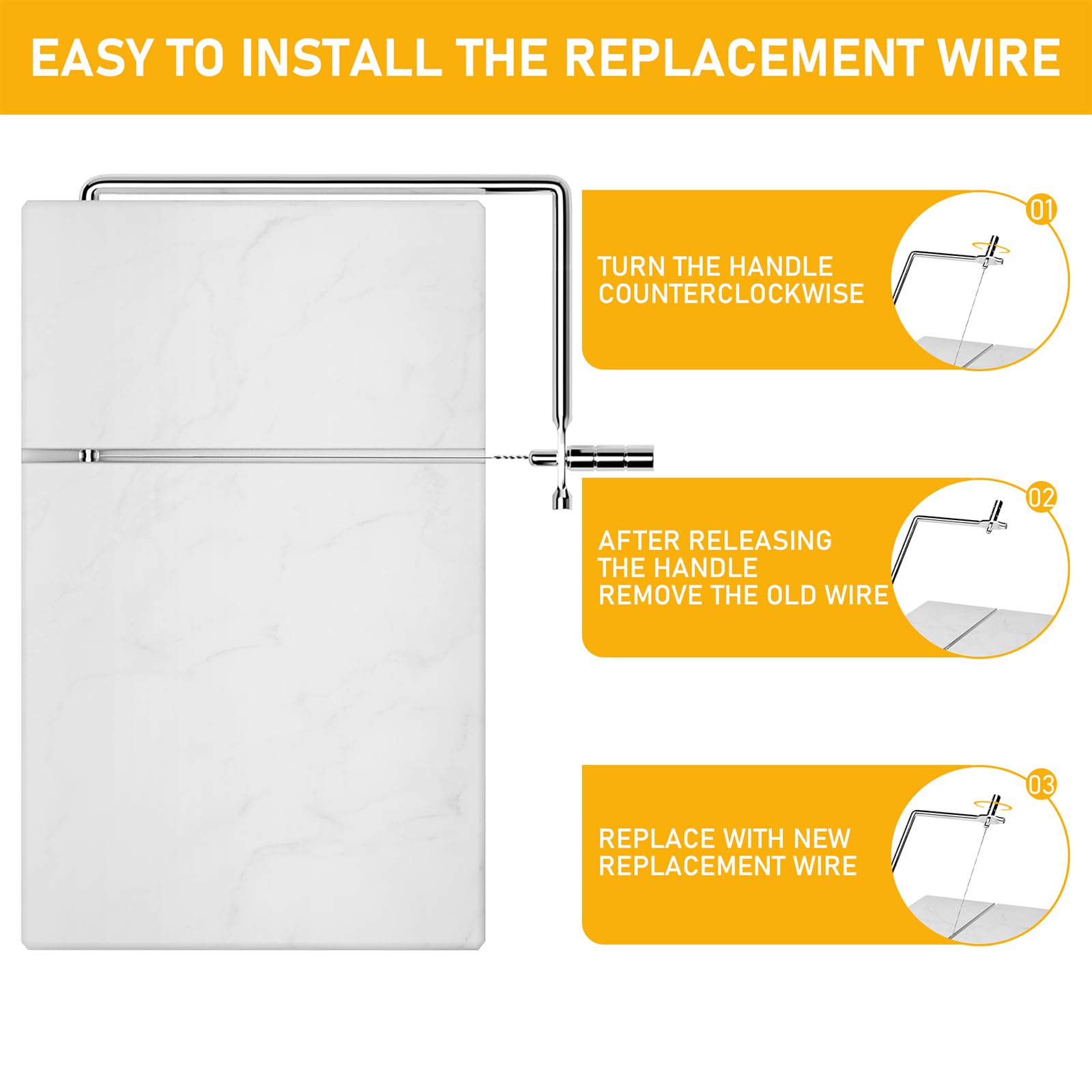 • NO MORE WORRYING ABOUT BROKEN WIRES: Our Cheese Cutter comes with 5 thicker and stronger replacement wires to ensure you're always ready to slice through cheese. With a preinstalled wire and the added spares, you'll never have to worry about a broken wire again. The durable and reliable design makes it a must-have addition to your kitchen, for effortless and precise cutting every time. ( To install the replacement wire, Please refer to our installation video. )