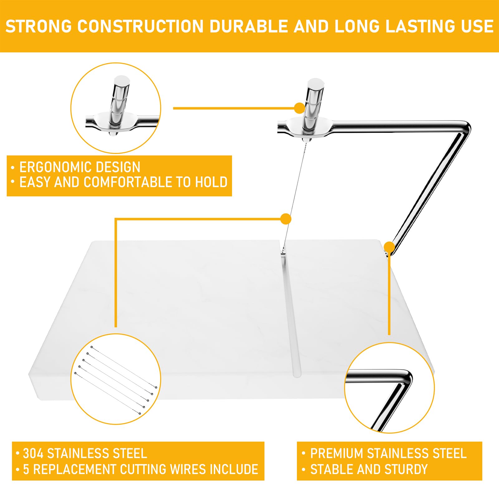 • SLEEK AND STURDY DESIGN FOR EASY CHEESE CUTTING: Make slicing cheese a breeze with our stainless steel wire cheese slicer. The non-slip rubber feet keep it securely in place, while the sleek and durable design makes it an attractive addition to any kitchen. Simply wash the slicer and store in a dry, well-ventilated spot between uses for long-lasting functionality.