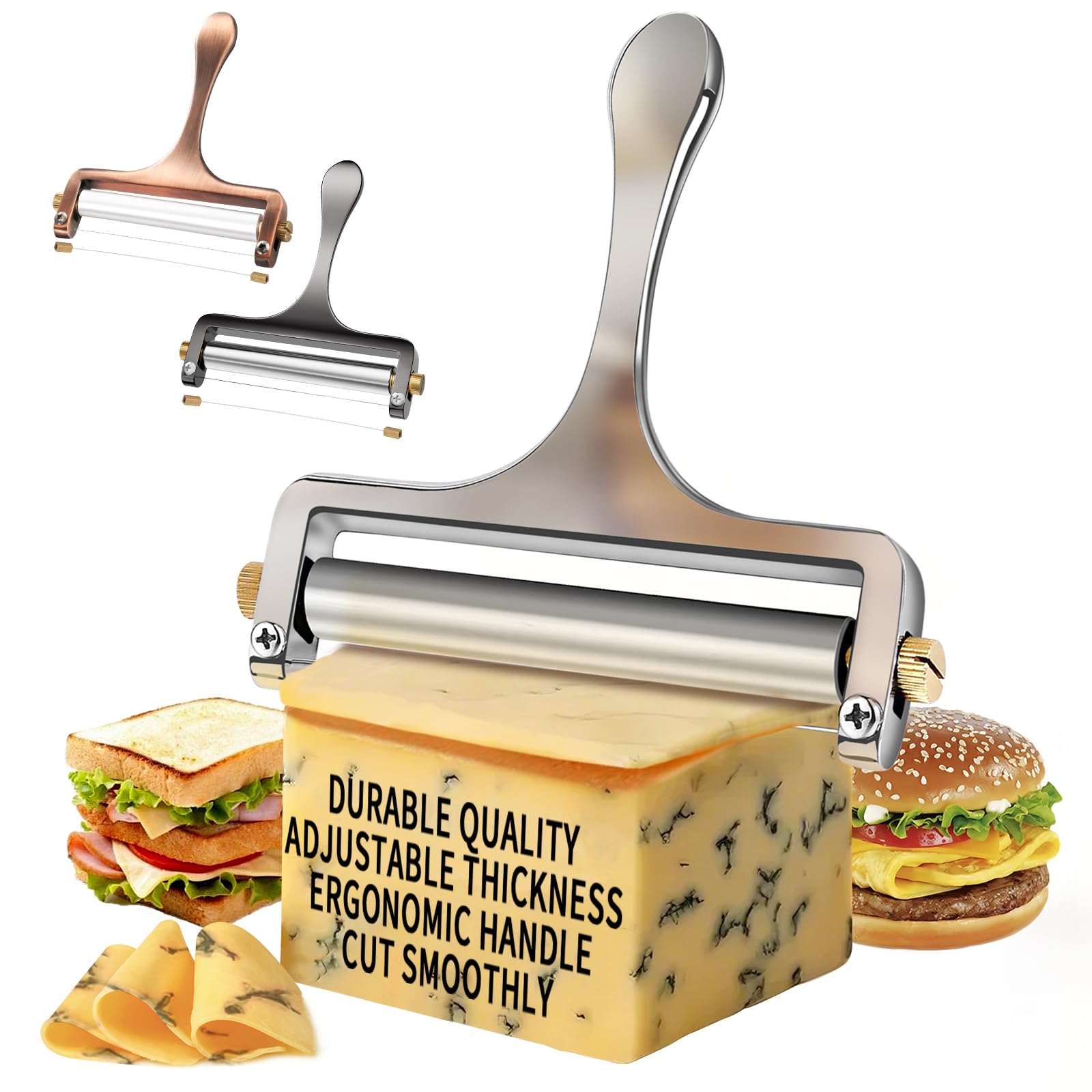 • HIGH-QUALITY MATERIAL CHEESE SLICER TOOL: The Cheese Slicer is made of premium quality (zinc alloy) metal material, with high-quality 304 stainless steel wire and a smooth roller that can provide a very sturdy durable, and comfortable handle. The cheese slicer with wire product is a delicately elegant design that will accompany you for a long time. It comes with 1 extra replacement stainless steel wire. The nice look makes you want to use it right away.