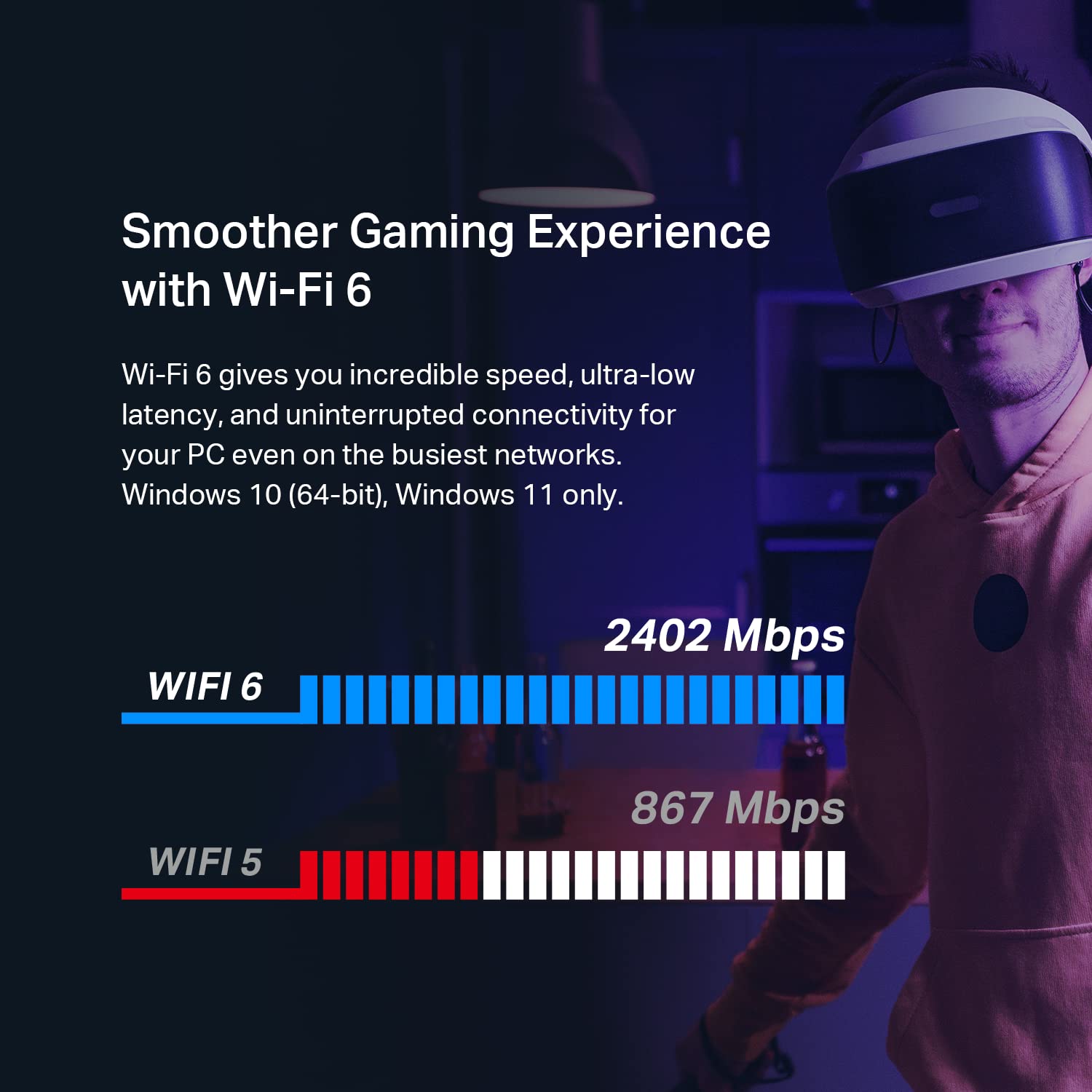 Details: TP-Link AX3000 Wi-Fi 6 Bluetooth 5.2 PCIe Adapter - High Performance for High Demands. The very latest WiFi standard, Wi-Fi 6, provides extreme speed, ultra-low latency,and uninterrupted connectivity so you enjoy faster downloads, smoother streaming, and more immersive gaming. Wi-Fi 6 comes with 1024-QAM and 160 MHz bandwidth for powerful, continuous WiFi. Bandwidth-intensive applications like VR demand high speeds, which Wi-Fi 6 deliversโ3ร faster than Wi-Fi 5. Just insert Archer TX55E into your PC for fully immersive VR experiences. High-Gain Antennas for Broader Coverage- Two powerful signal-boosting high-gain antennas greatly extend existing WiFi coverage, offering a fast and smooth online experience further away. Connect and Enjoy via the Latest The latest Bluetooth 5.2 Technology, achieves speeds 2ร faster and 4ร broader coverage than Bluetooth 4.2 to perfectly coordinate with your game controllers, headphones, keyboards, and other Bluetooth devices. Cutting-Edge Security- WPA3, the latest network security standard that provides safer and individualized password encryption, protects your network from wireless hacking and ensure your wireless connection is completely secure while surfing the web and shopping online. Ingenious Details Make a Perfect Whole. A customized heat sink improves connection stability by efficiently dissipating thermal energy. Additionally, gold plating on every contractor prevents oxidation. This attention to detail ensures your adapter is crafted for ultimate performance.