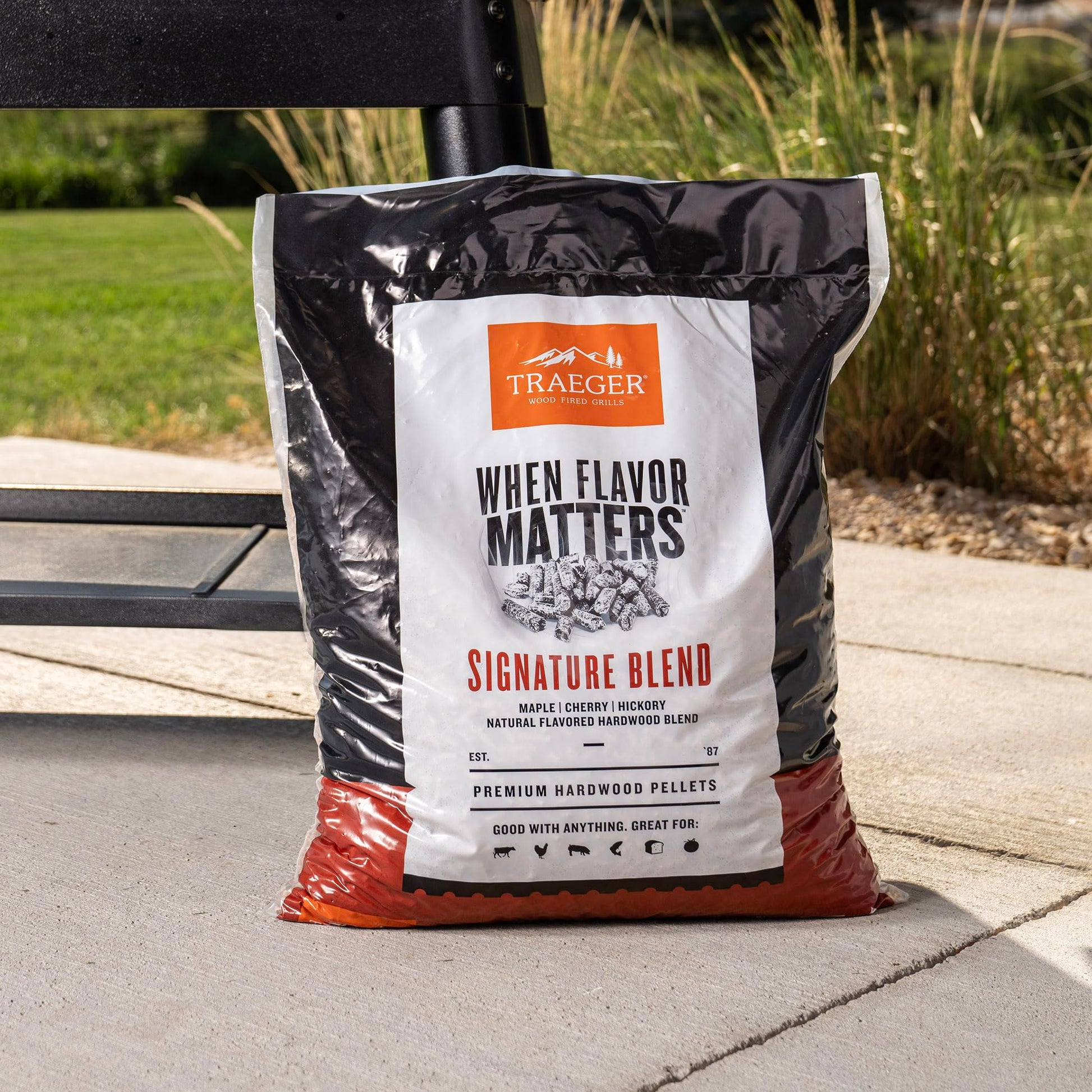 • SIGNATURE BLEND WOOD FIRED FLAVOR: The flavors of hickory, maple, and cherry hardwoods combine for in our Traeger Signature Blend Hardwood Pellets for flavor that can take on just about anything you cook; From classic BBQ meats, to fish and veggies, this versatile blend gives you full-bodied flavor you'll go back to time and time again