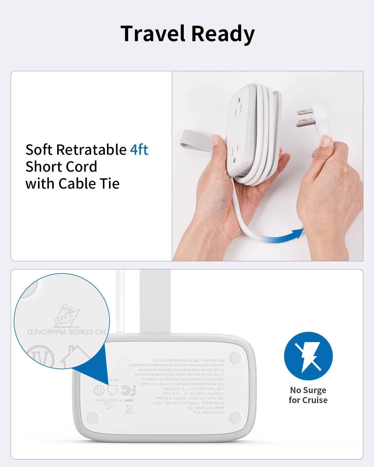 • 【Special Wrapped Cord Design】: 4Ft short extension cord wraps around this travel power strip which helps to get rid of tangling cords, Also equipped with reusable fastening cable ties can tie up the cord. According to the indicated wrap around the body of the strip, Soft retractable extension cord with a 45-degree angled flat plug can be hidden into the trunking and ac outlets, easily fit into your pocket, luggage, and bag.
