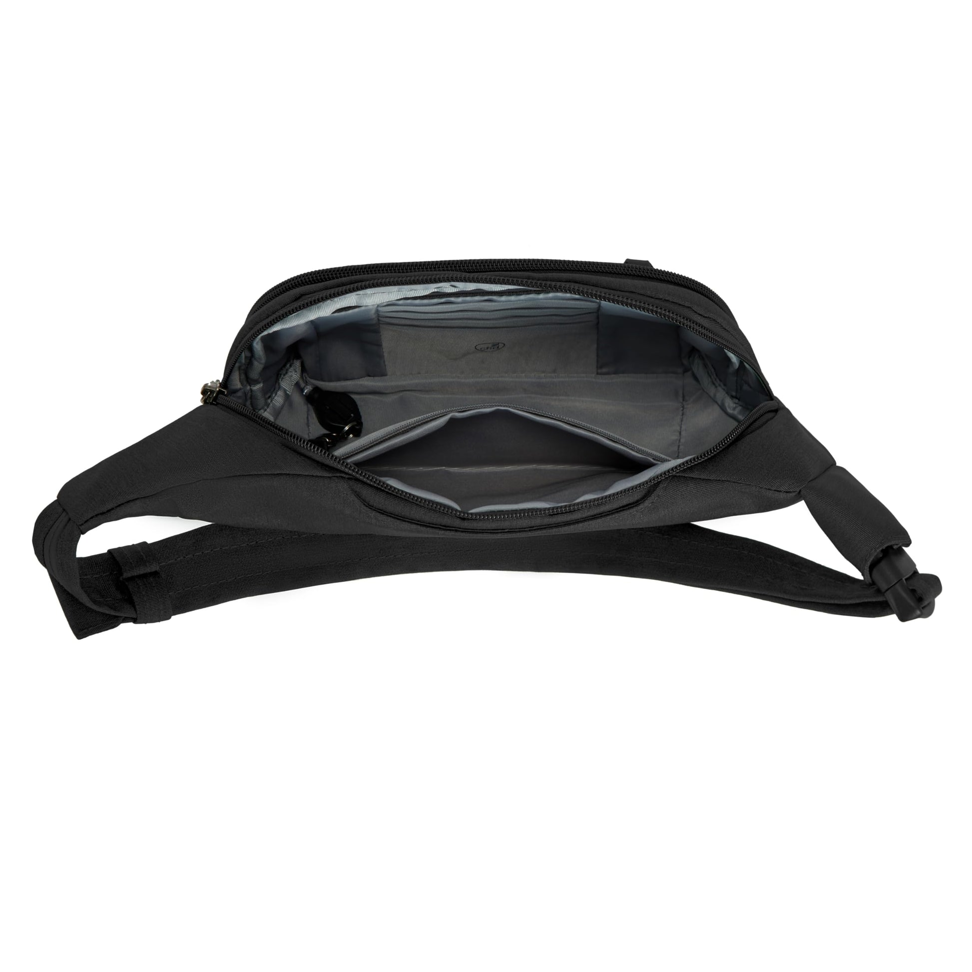 To travel effortlessly, you've got to travel lightly - and that means abandoning bulky bags. The Anti-Theft Metro Waist Pack is the perfect solution. Three zippered compartments combined with a wealth of practical features make this a versatile choice. The main locking zippered compartment features a zippered wall pocket, a tethered key clip, 4 RFID protected card slots, a RFID protected Passport pocket plus ample room for additional items. RFID protection keeps your identity secure from high-tech electronic readers trying to steal your identity. The two front zippered compartments; one locks for additional security allow you to keep your items organized and the rear slash pocket keeps your smartphone easily accessible. Anti-Theft features like locking zippers, slash-resistant body panels and a slash-resistant, adjustable strap that can be attached to a stationary object to prevent a grab-n-go provide you with piece-of-mind when you're on-the-go. Thoughtfully designed with water and stain resistant Polyester material and accented in rich gun-metal hardware. The fabric covers the buckle to prevent thieves' from opening the buckle and the strap fits waists up to 56'. Travel hands and worry-free with the Metro Waist Pack.