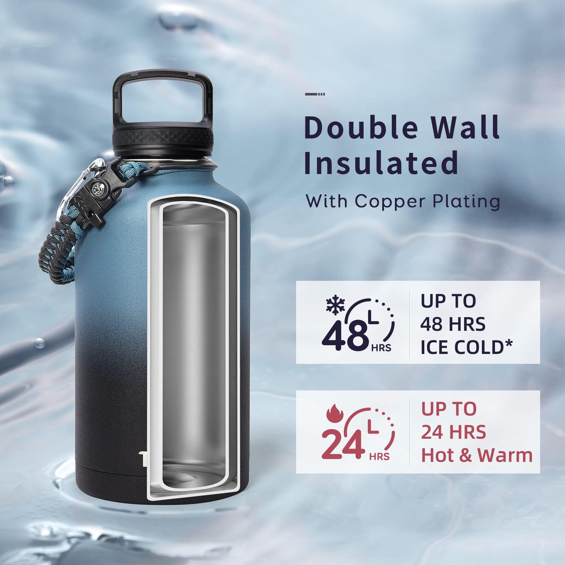 • 48hrs Cold /24hrs Hot Insulation: Vacuum Double wall stainless steel water bottle with copper plating maxes its keep water ice cold long time , allowing you to enjoy your favorite flavor in the long run.Ice retention longer,you can always get cold water.Good ideal for outdoor sports, office, gym and more!