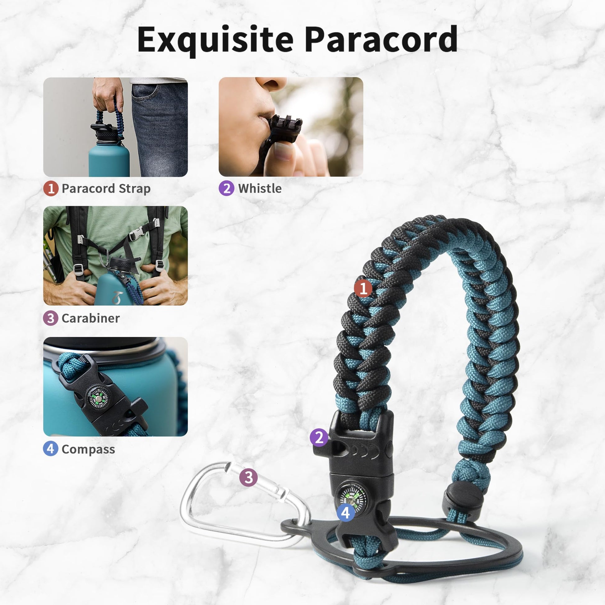 • Full-function Paracord Handle: Brilliant paracord of matching colors bring out the bottle with a touch of youthful vibe. Compact compass and handy carabiner make the bottle the ideal survival kit for expeditions in the wild
