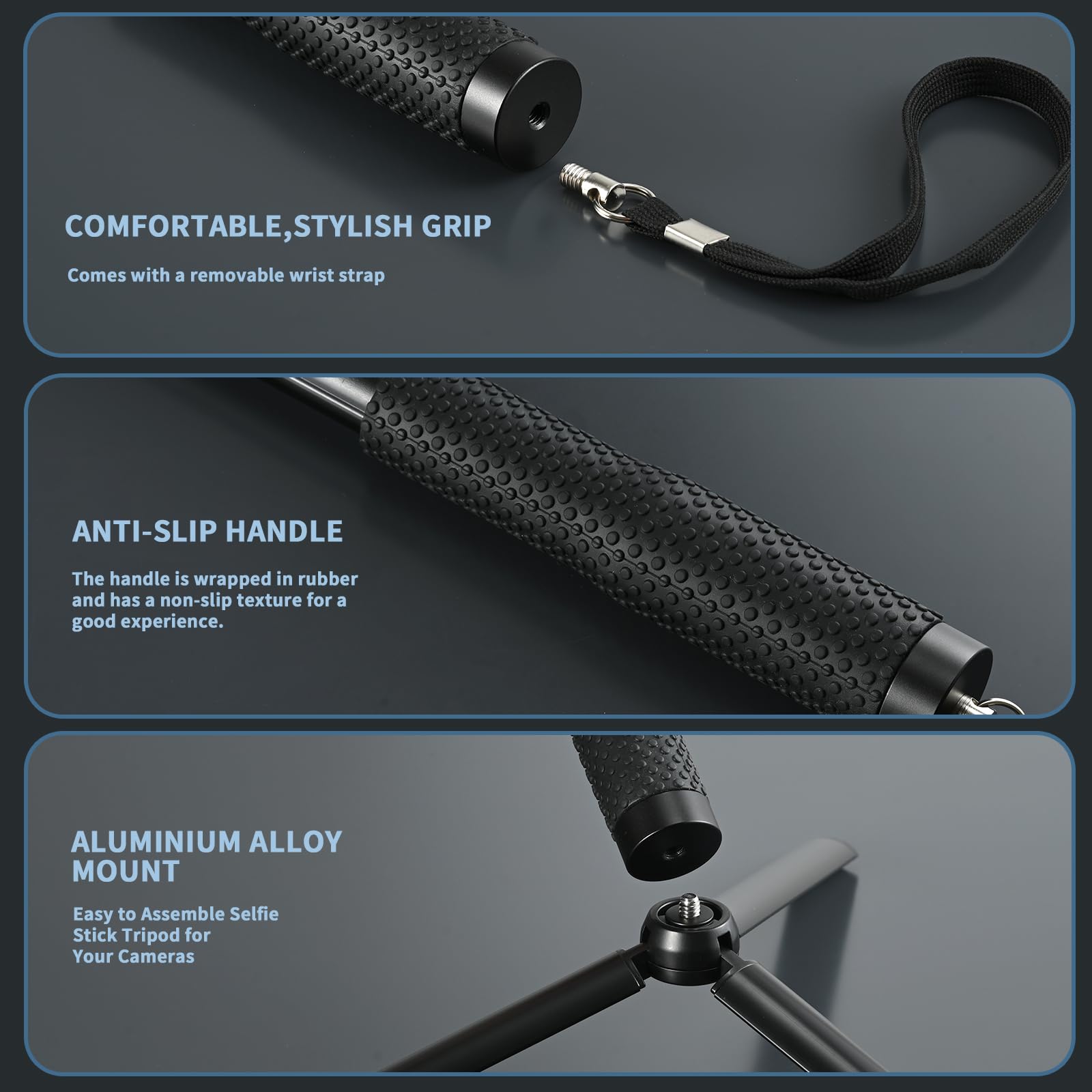 • 【Versatile Design for Expansion】The hand grip the bottom built with a standard 1/4'' tripod screw hole which allows you connect this stick with any tripod to free your hand while shooting, vlogging or taking a video.