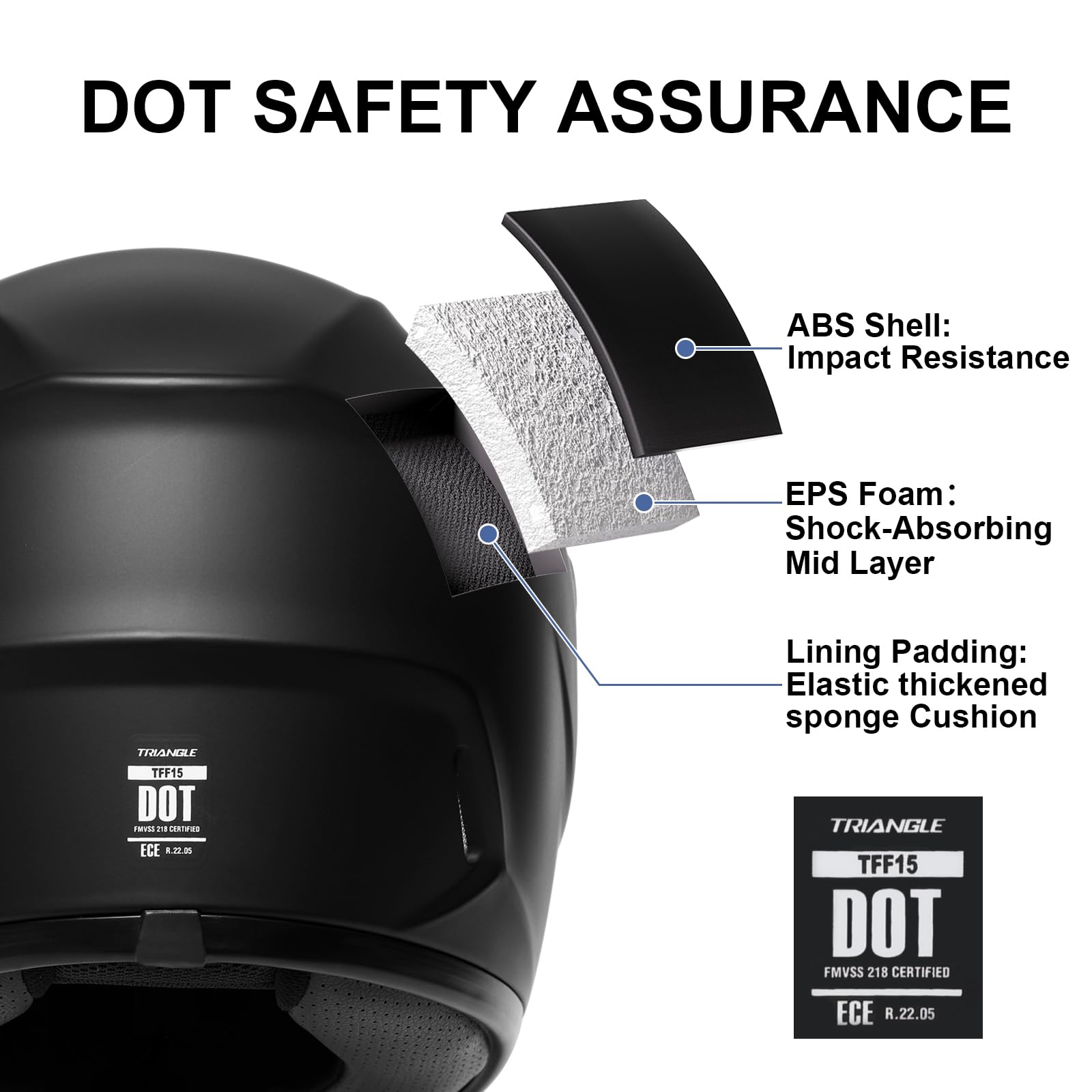 • Dot certification: Triangle motorcycle helmet meets dot fmvss-218 safety standards, constructed with abs shell and eps linere