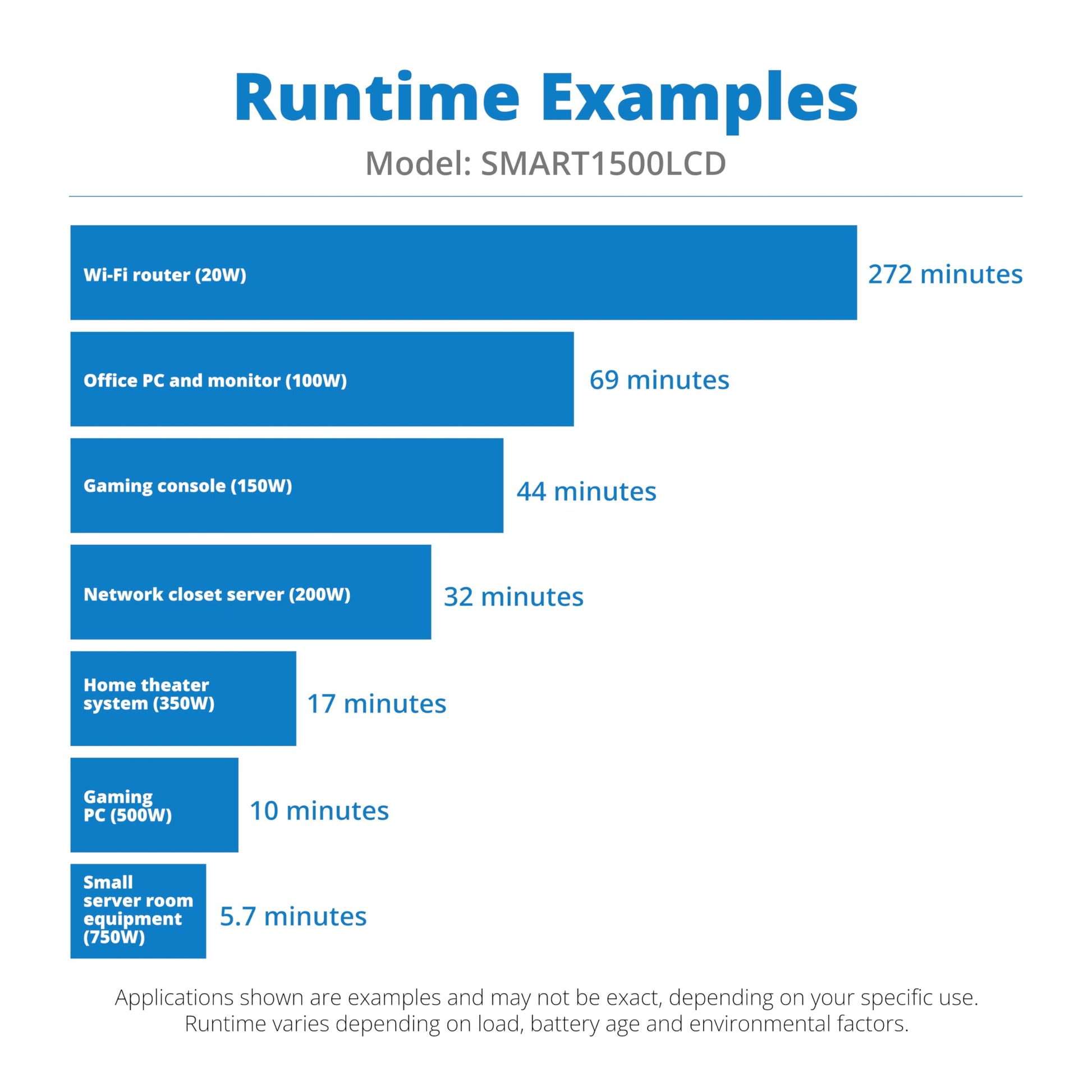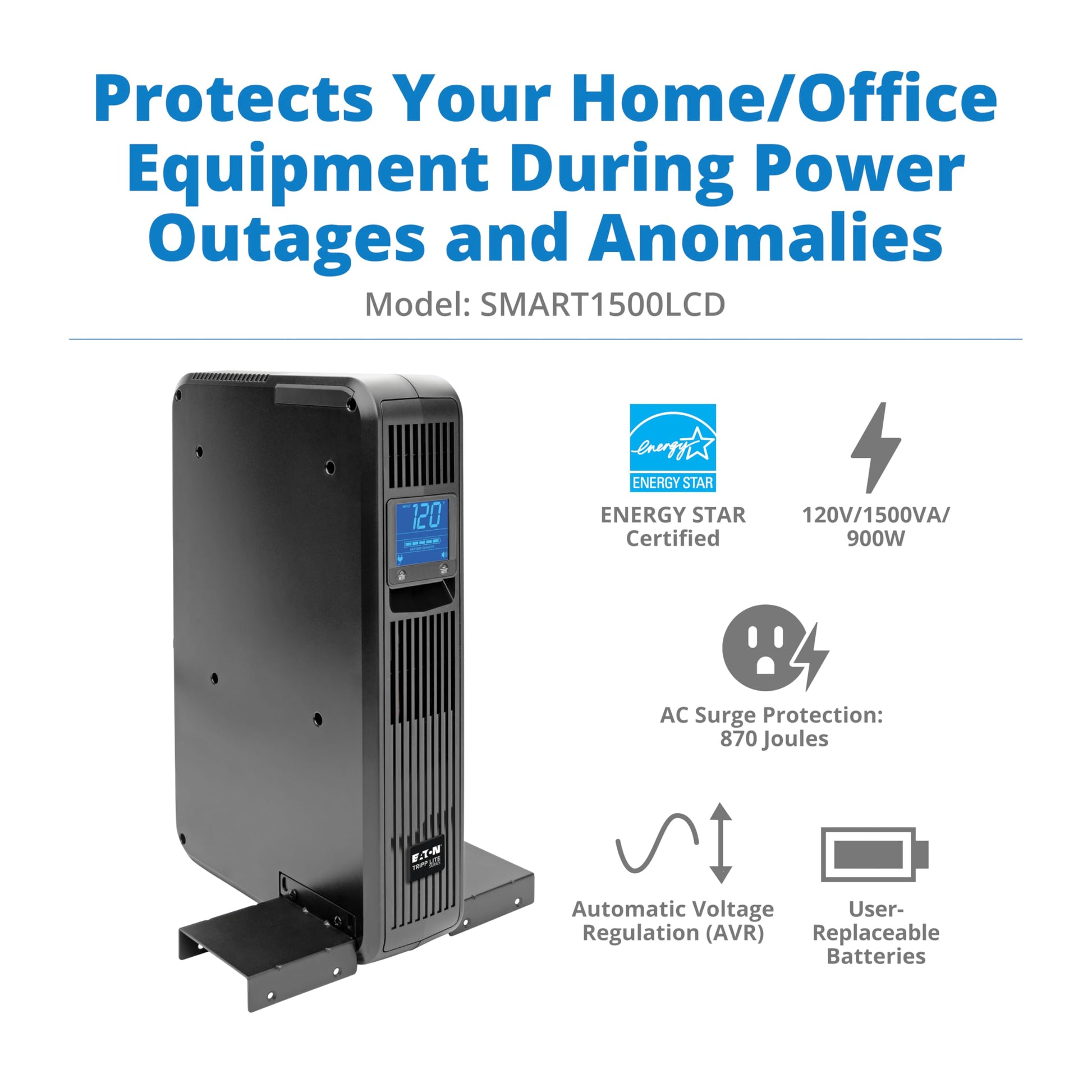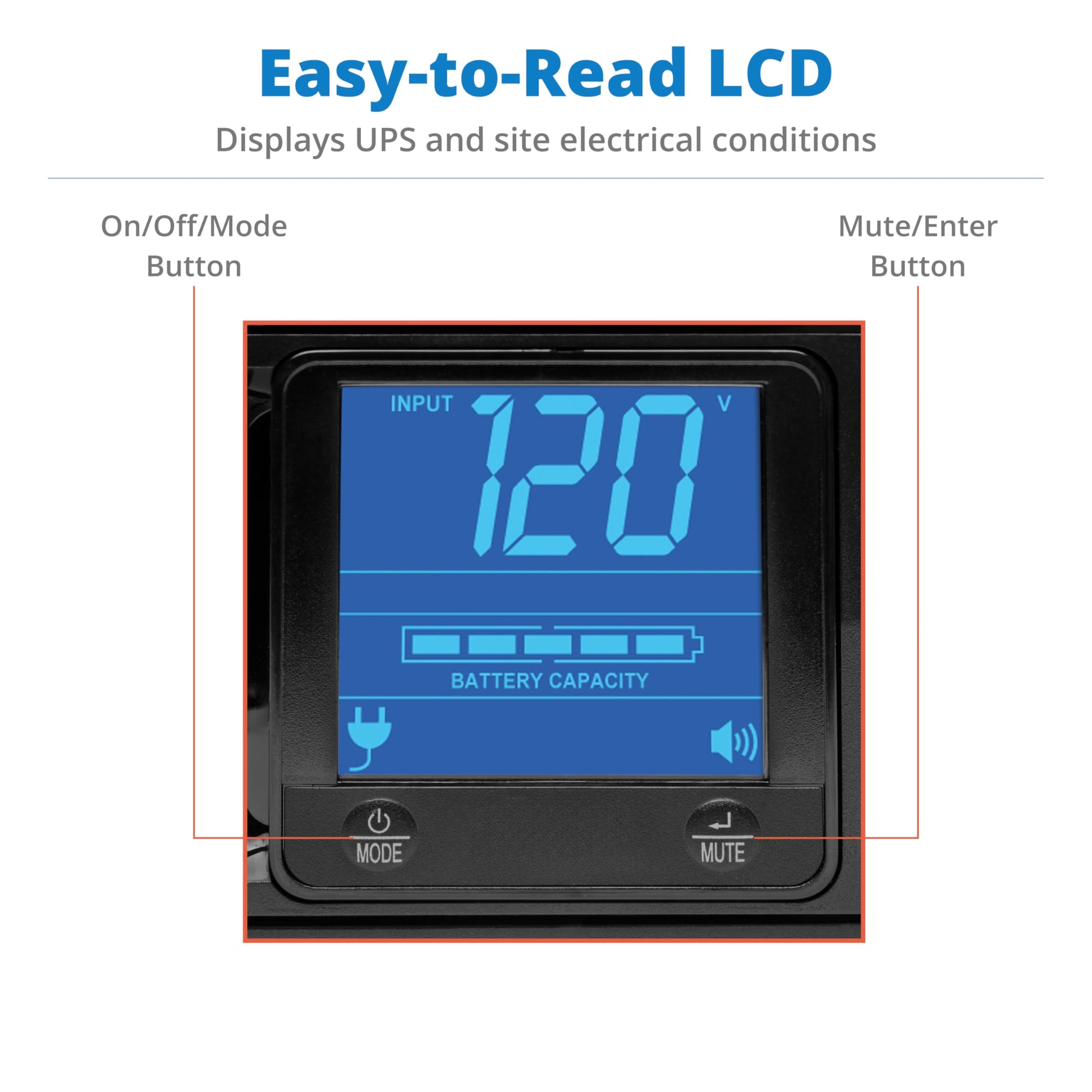 Details: 1500VA / 900W UPS Battery Backup for Networks, Home, or Digital Signage SMART1500LCD line-interactive UPS provides battery backup and AC power protection against blackouts, brownouts, overvoltages, surges and line noise. Eight standard outlets provide PWM sine wave AC output. The large LCD indicates operation details including voltage, runtime, load, battery and operating mode. Internal battery can easily be replaced with Tripp Lite's RBC1500 model replacement battery.