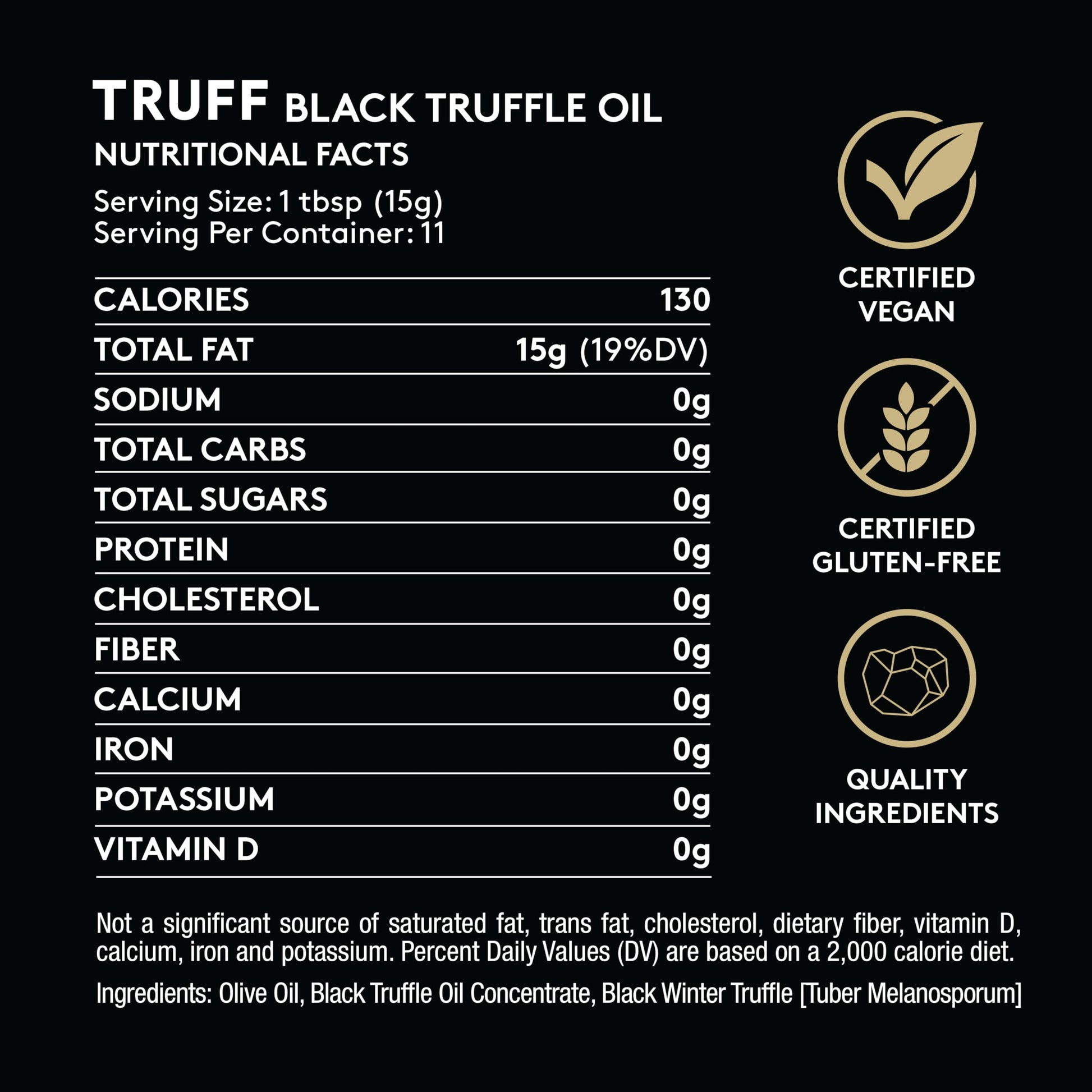 • Only The Best Ingredients. It’s a delicate blend of olive oil and real black winter truffle. No artificial flavors here. We carefully selected neutral-flavored olive oil as a base to let that pure truffle goodness shine through. TRUFF Oil is All-natural, non-GMO, trans fat-free, cholesterol-free, sugar-free, sodium-free and gluten-free.
