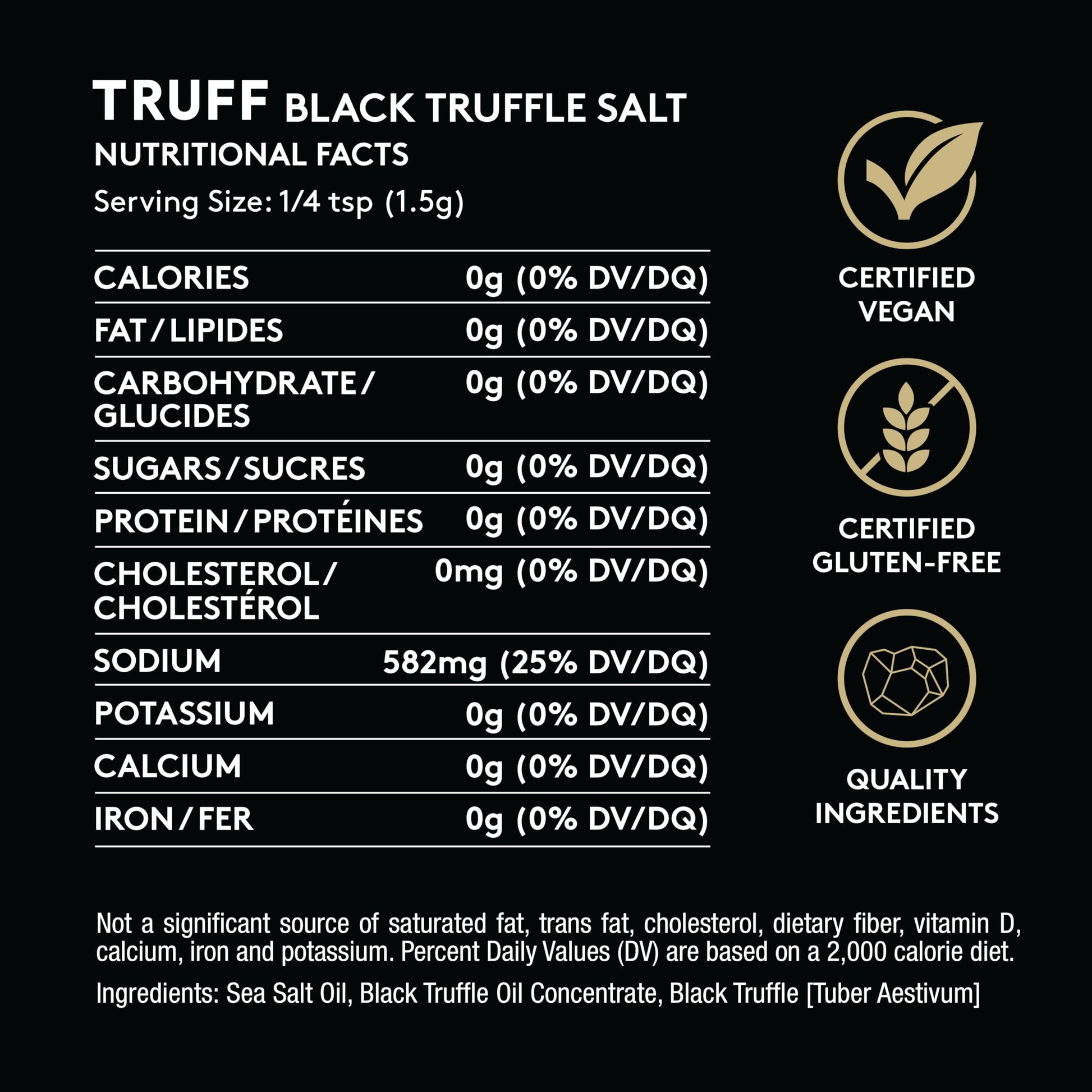 • Our most versatile TRUFF yet. Our Truffle Salt is the easiest, most versatile way to enhance every dining experience with real black truffles. It elevates steak, pasta, eggs, and popcorn by adding the perfect hint of truffle to the flavor of your ingredients.