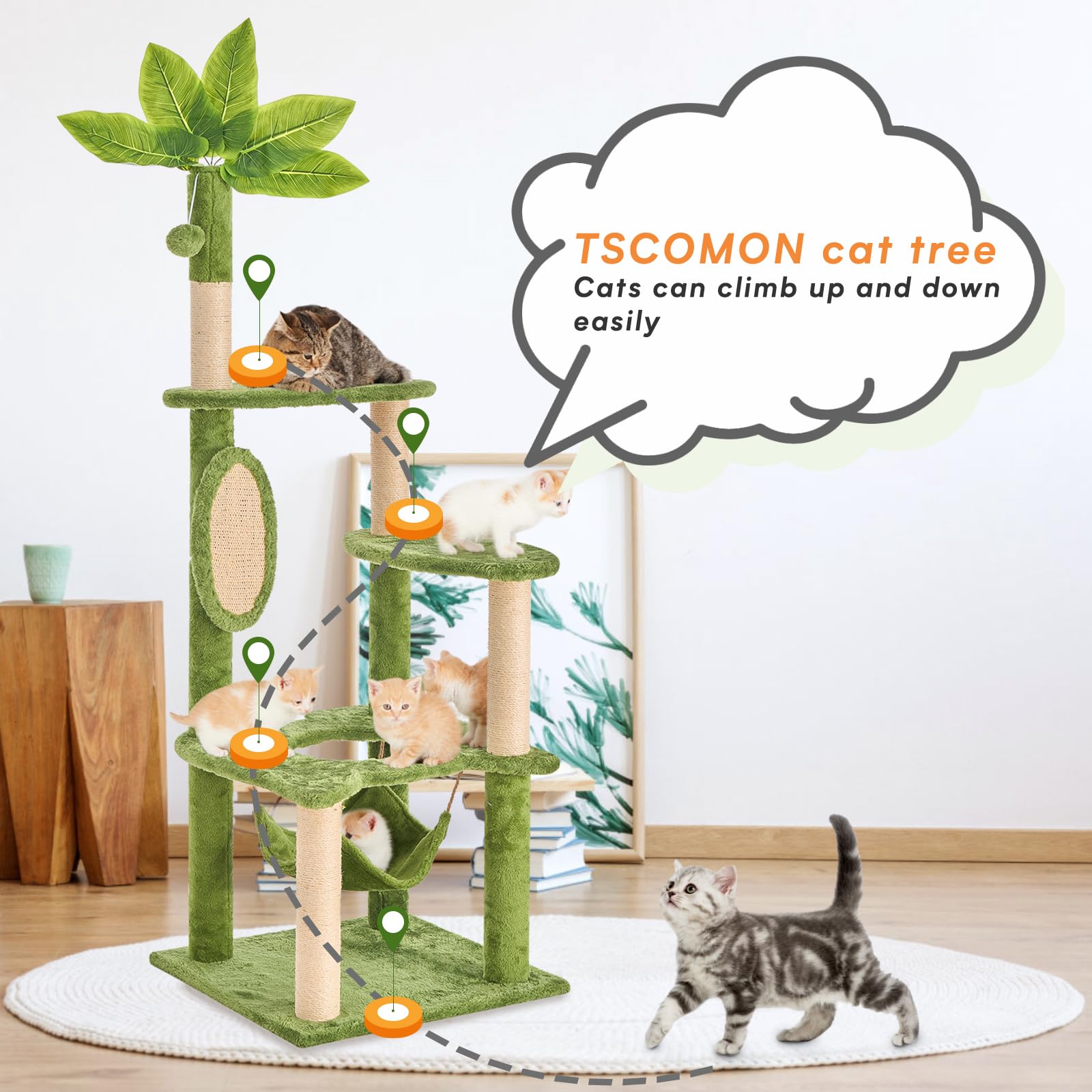 TSCOMON 55" Cat Tree for with Green Leaves, Multi-Level Large Cat Tower with Hammock, Plush Cat House with Hang Ball Toy and Sisal Scratching Posts Furniture, Green