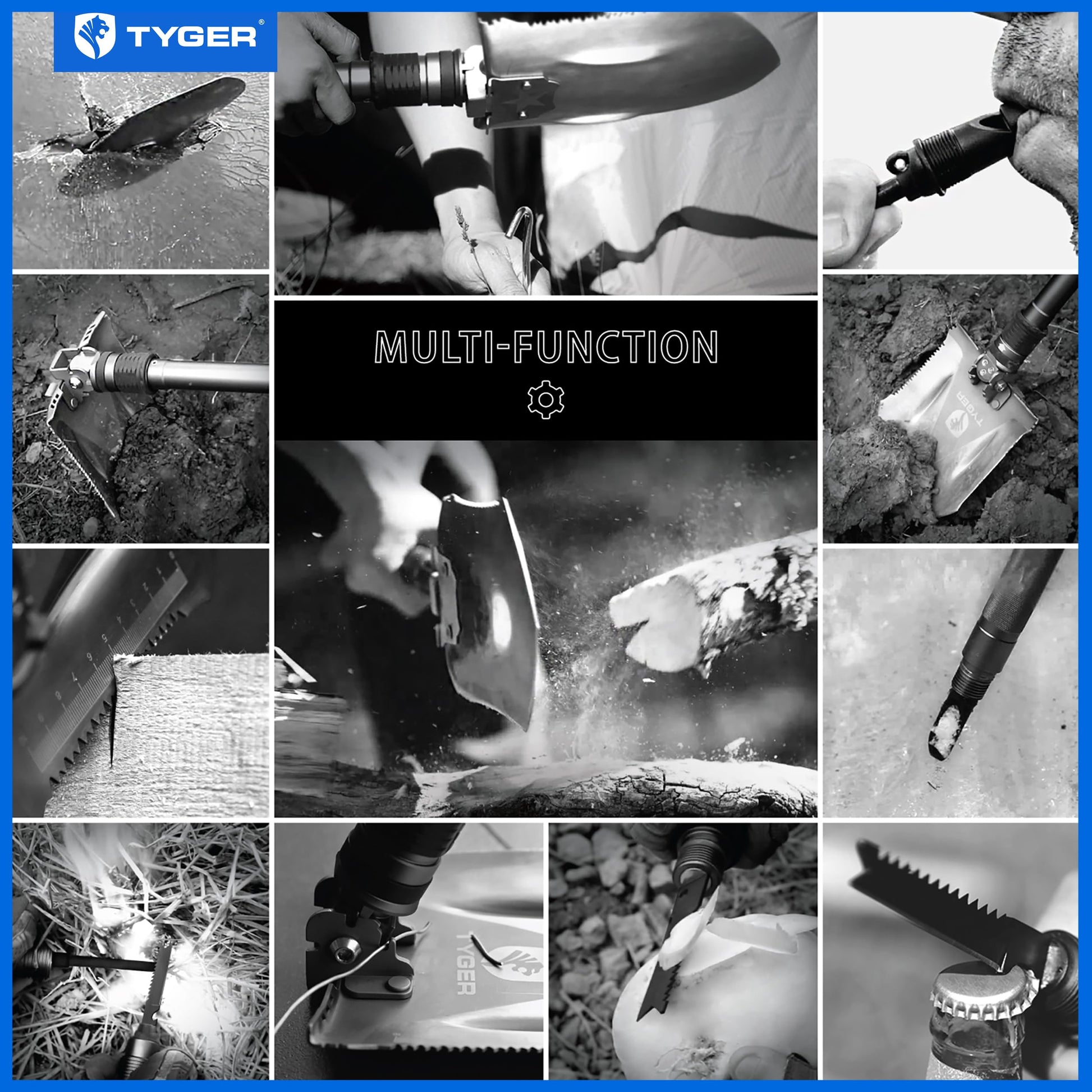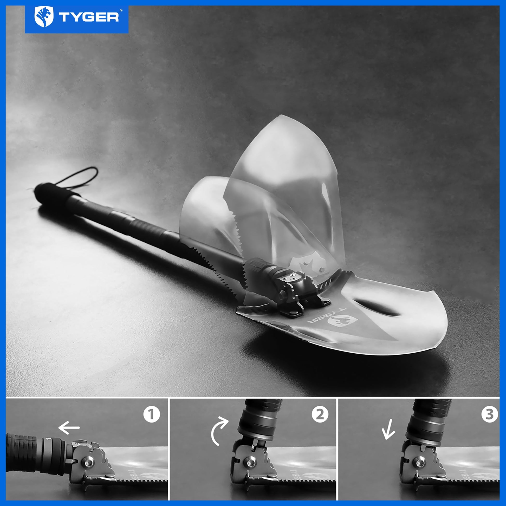 • Why TYGER ? US registered patent design shovel forged to last from military grade solid carbon steel and aerospace grade anodized aluminum tubes.