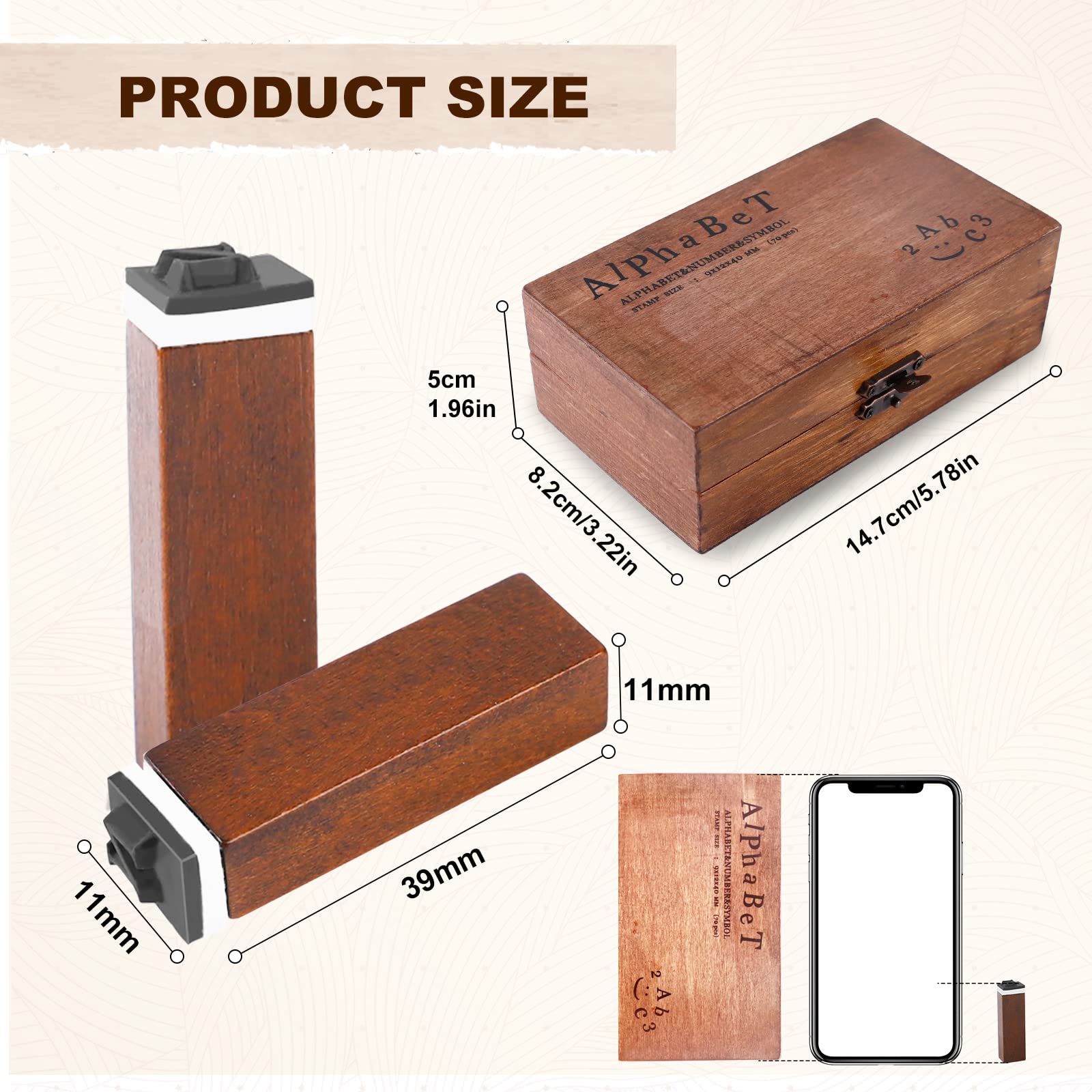 • Product Size : As school supplies, the size of wooden box is 5.78*3.22*1.96 inch. The size of wooden stamps kit is 0.43*0.43*1.54 inch. The size of word is 0.24*0.28 inch(Each letter has a slightly different size,approximately 0.04-0.08 inch)