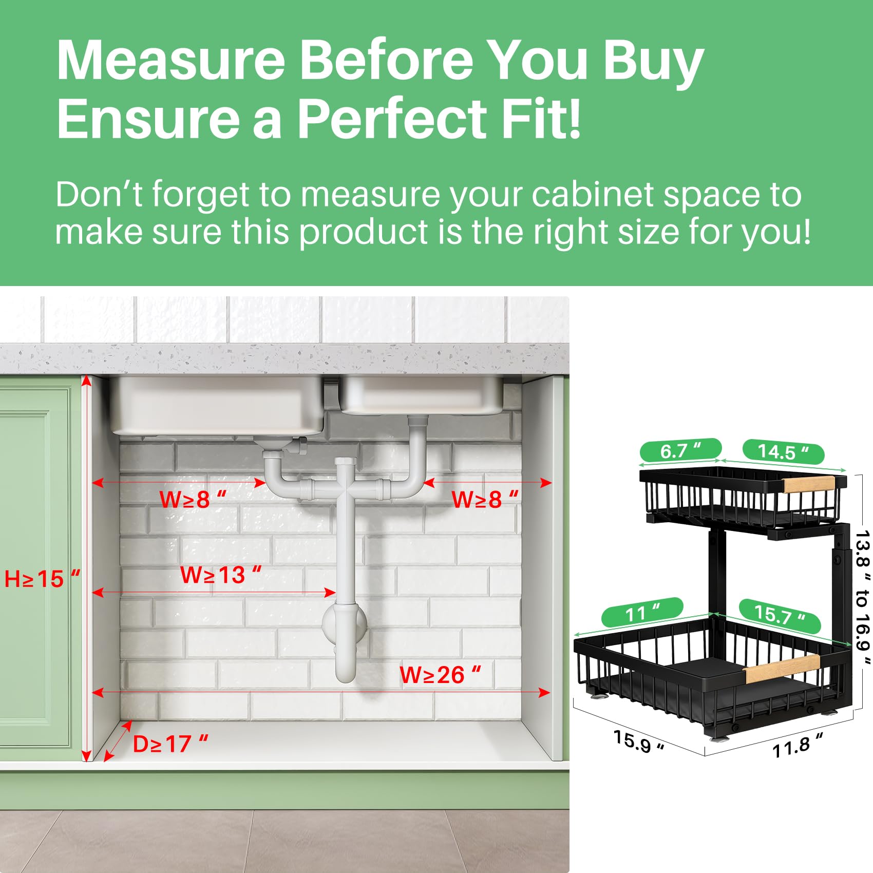 • Larger Organizer for Maximum Efficiency: This under sink organizer, measuring 11.8'W x 15.9'D x (13.8'-16.9')H, providing more capacity for storing taller bottles, cleaning supplies and other essentials.Before purchasing, please double-check your cabinet dimensions to ensure this under cabinet organizer fits properly.