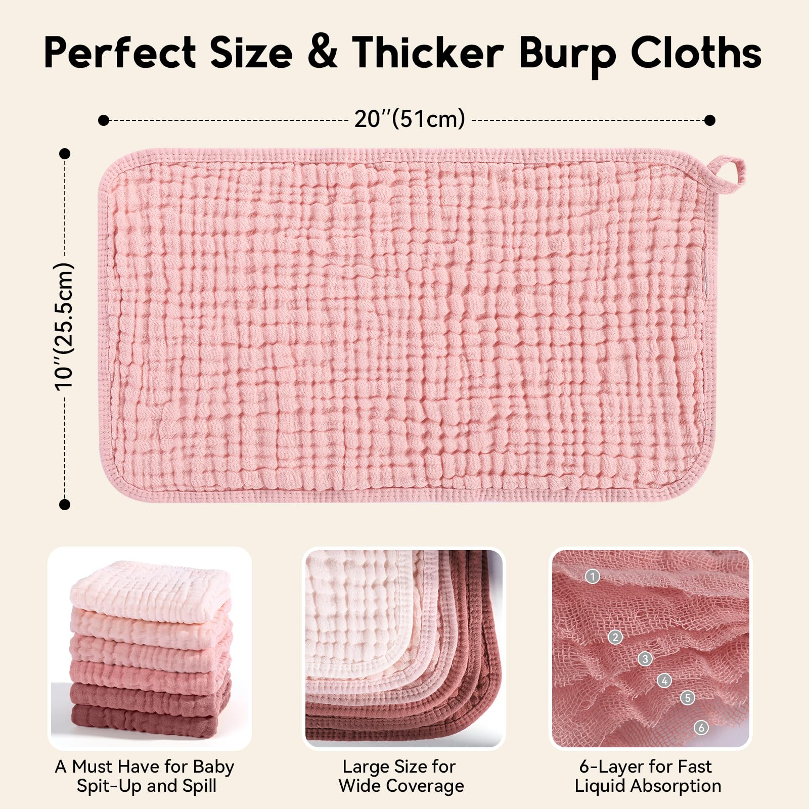 • ❤Excellent Absorbent: Featuring 6 layers of absorbent muslin and fluffy structure design, our burping cloths for babies provide maximum absorption with tendor touch, works well to protect your teething baby from all dribble and spit ups soaking their clothes. Large 20''X10'' size provides maximum coverage and extra layering adds durability, making them ideal for use in any season.