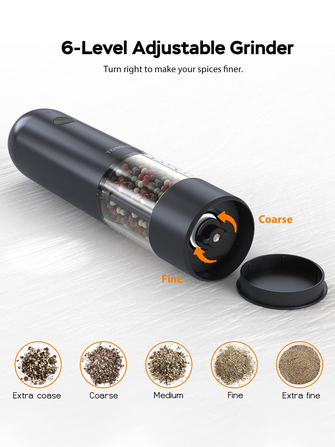 • 6-Level Adjustable Coarseness: Equipped with high hardness ceramic grinder, TOMEEM Electric Salt & Pepper Grinder Set is best choice for releasing the original aromas of the spices while grinding. 6 Coarseness settings are provided for kitchen lovers grinding spices from coarse to fine, meeting the vast majority of culinary needs