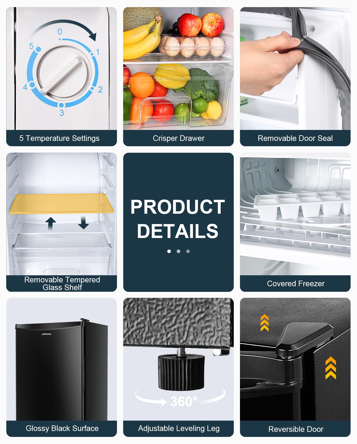 • Energy-efficient & Quiet: The mini fridge energy cost is estimated to be as low as 0.5 kWh per day. The small refrigerator working noise is 38 dB, roughly at the level of quiet rural area. Economic and quiet, you will hardly notice its existence when it’s cooling all your food & drinks, ideal appliance for bedroom, study and quiet space