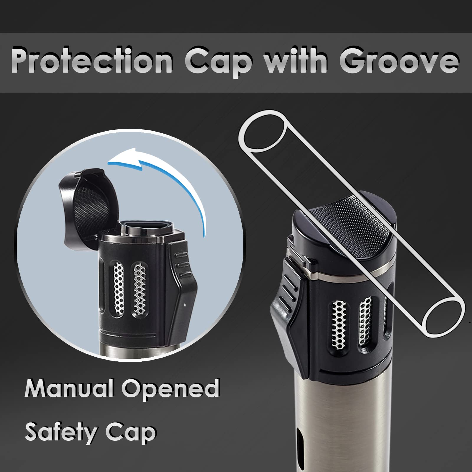 • SAFETY CAP & GROOVE DESIGN: This triple jet torch lighter has a manual opened safety cap (attached). The safety cap can prevent lighter from being accidentally ignited when placed in pocket or bag. Top groove design allows you to place small items