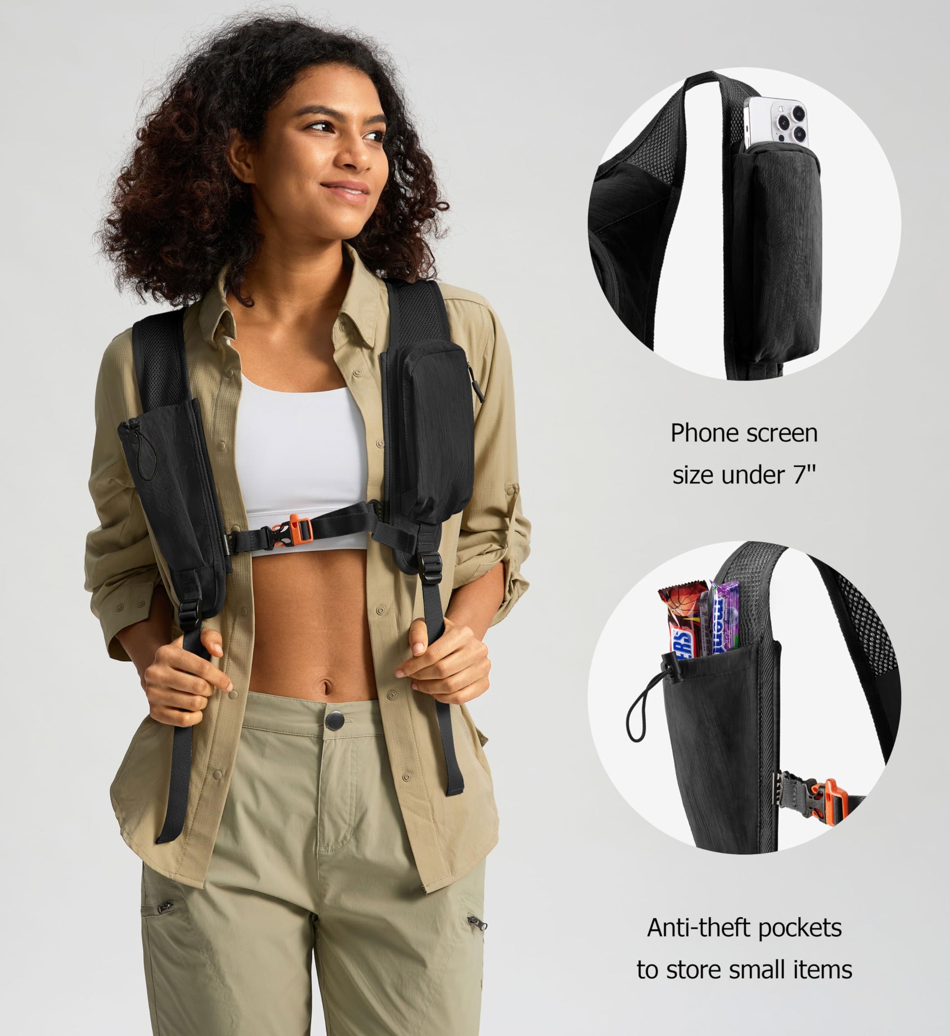 • CELL PHONE POUCH: The zippered pocket on the left shoulder strap will hold a cell phone screen up to 7 inches, and on the other side is an anti-theft pocket with an elastic cord closure, so you can put some items such as a wallet and snacks.