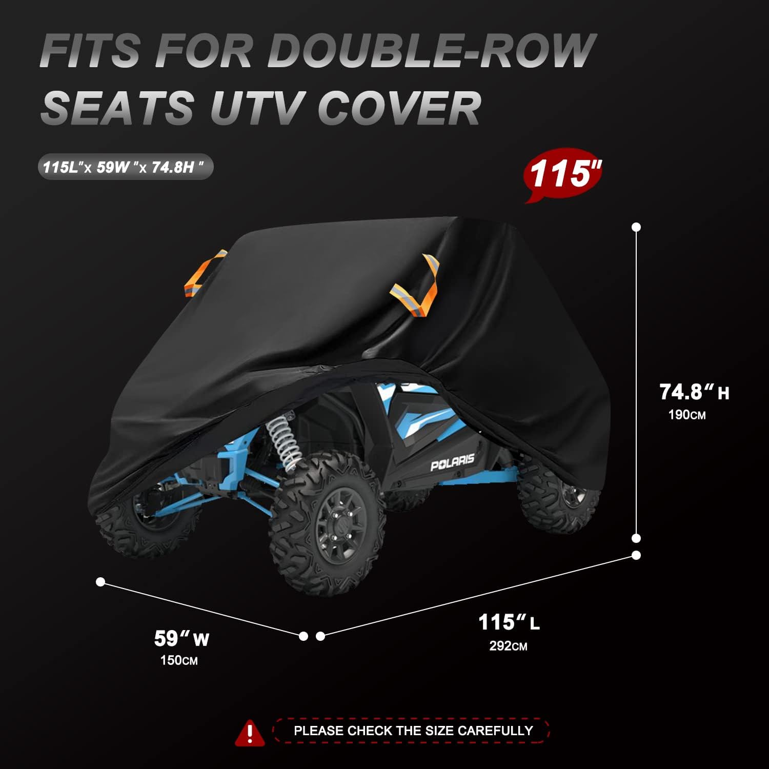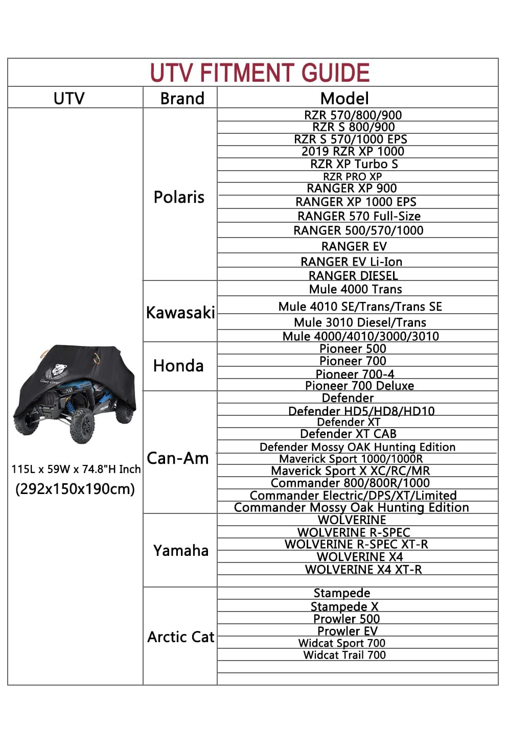 • Dimension: The 2 seater UTV cover dimension is 115'L X 59'W X 74.8'H, compatible with Polaris Ranger RZR, Yamaha Wolverine,Can am Defender Maverick Commander ,Honda Pioneer Teryx4,Arctic Cat Wildcat,Textron,cfmoto uforce,Kawasaki Mule,fit for most 2-3 seater UTVs