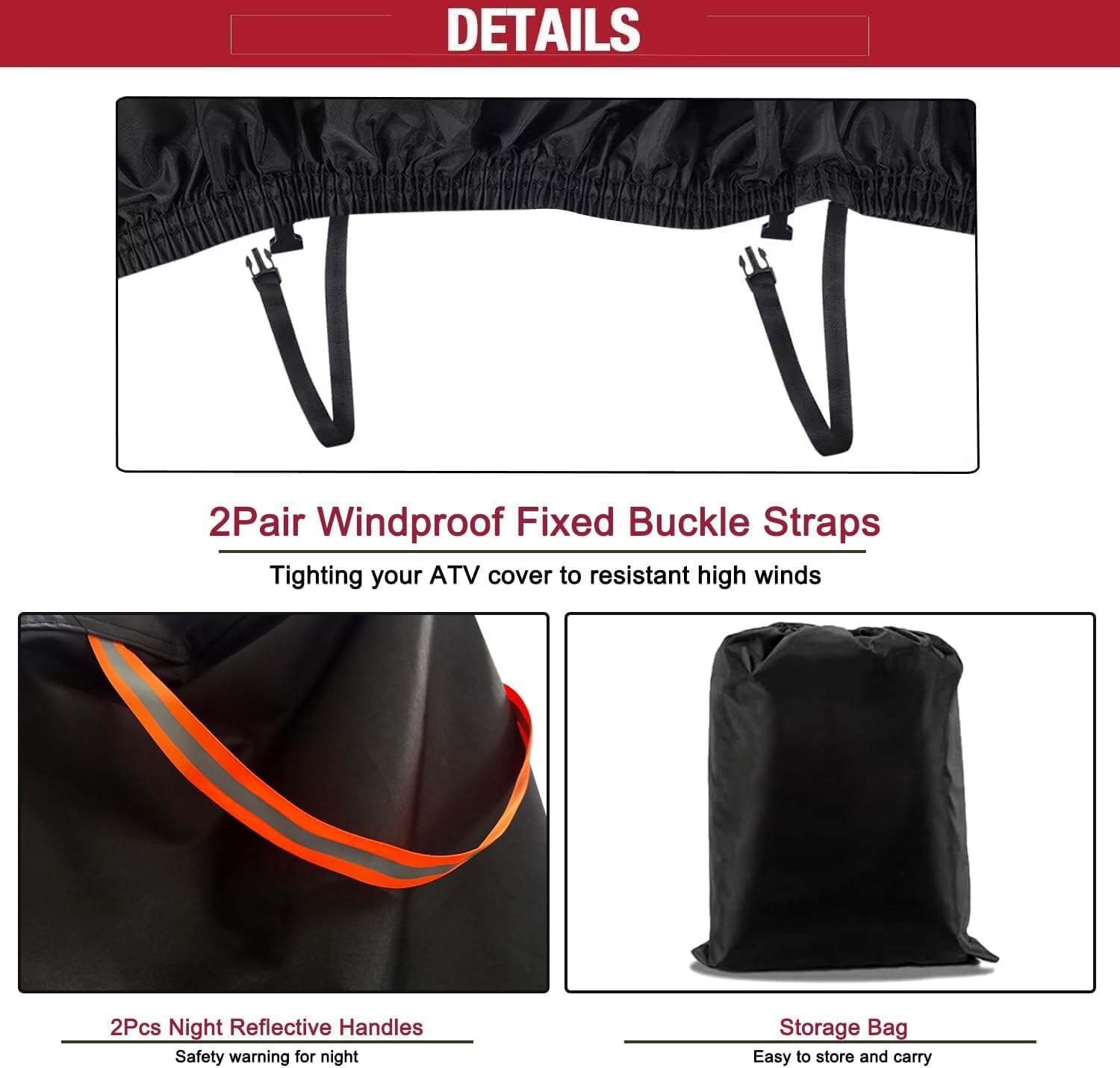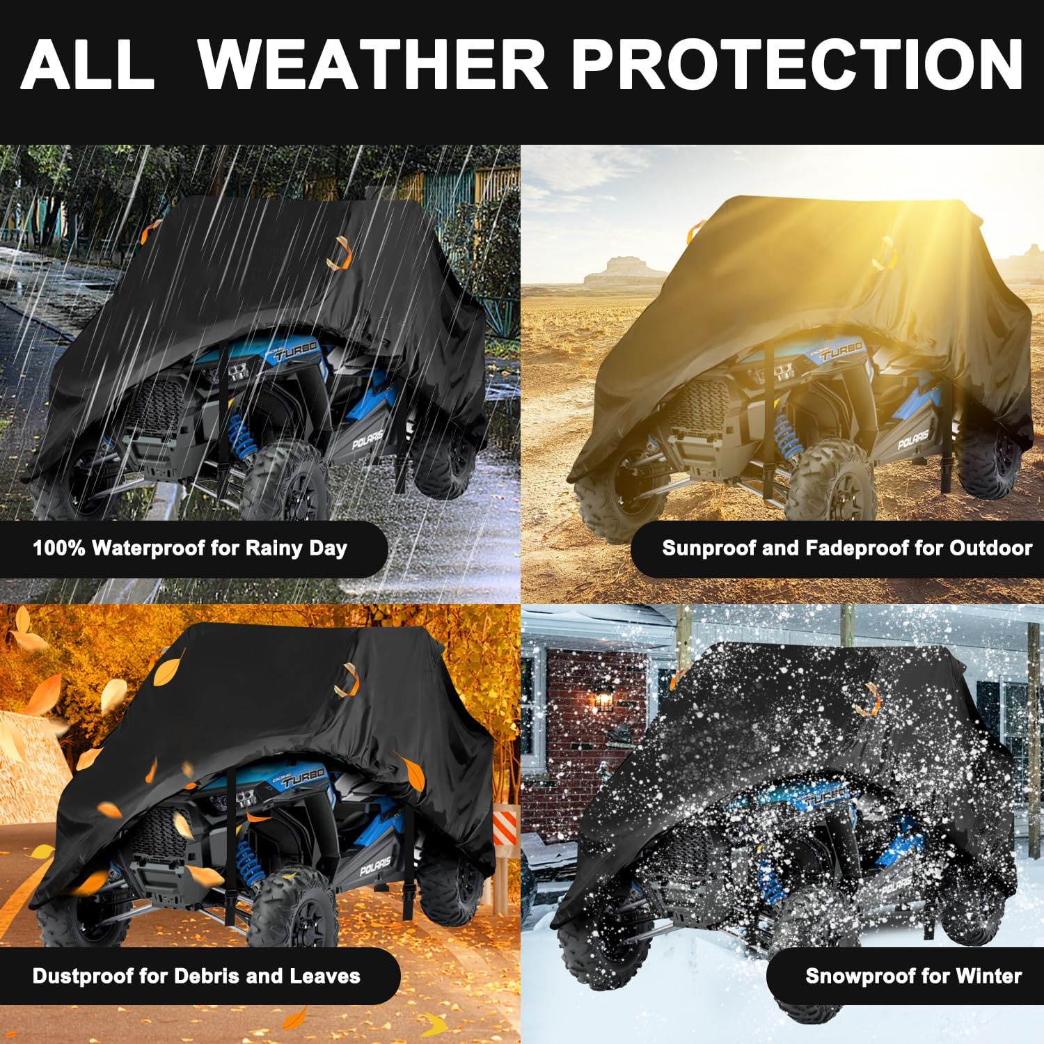 • 6 Details That Matter Designed: 1.Securing 2pcs windproof buckle straps at bottom provide excellent security on high windy days.2.Elastic hems design at bottom of cover tighting your UTV like a gloves.3.2pcs night reflective stripes design for warning at night,4.Double-stitched seams for durability in harsh weather.5.Waterproof tape at seam to avoid water into.6.Free storage bag