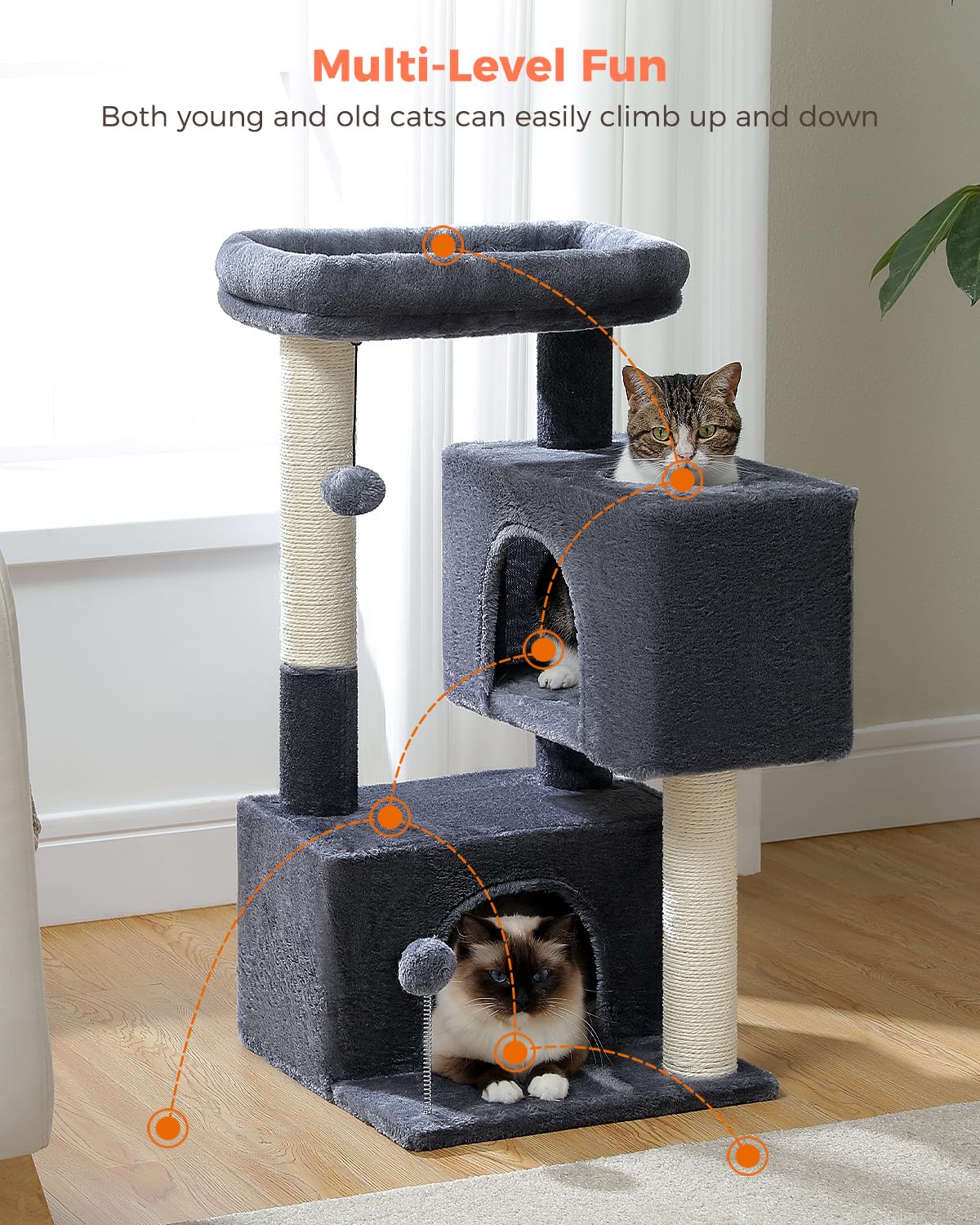 UYMI 32" Cat Tree Tower for Indoor Cats - 2 Cozy Condos, Multi-Level Cat Scratching Posts with Sisal, Soft Padded Perch, 2 Dangling Toys, Dark Grey