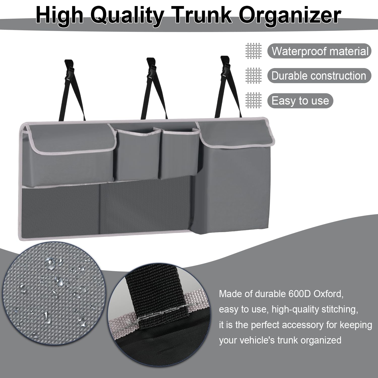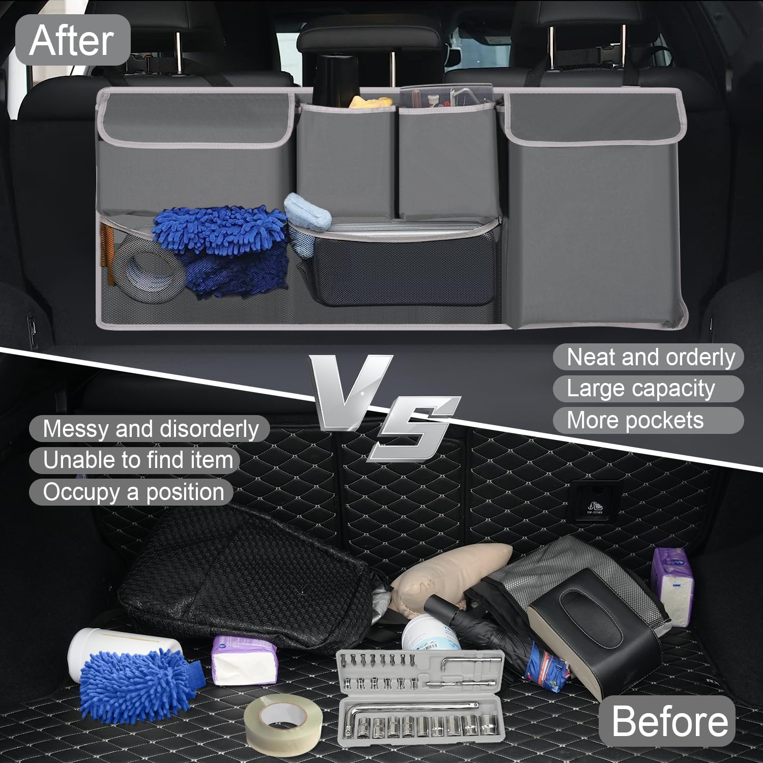 UYYE Trunk Hanging Organizer, Backseat Storage Bag, Collapsible Car Interior Accessories with 4 Pockets & 2 Mesh Pouches for Tools, Provide More Storage Trunk Space for SUV, Jeep, MPVs (Grey)