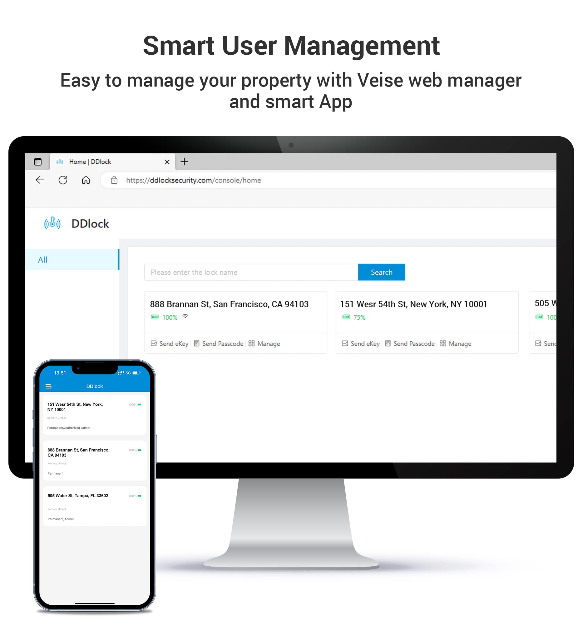 • App & Web Portal Control: You can control the smart lock via smartphone, remotely generate eKey and grant access, manage users, and view records in the app and website management system. The App & Web is free and can be used forever
