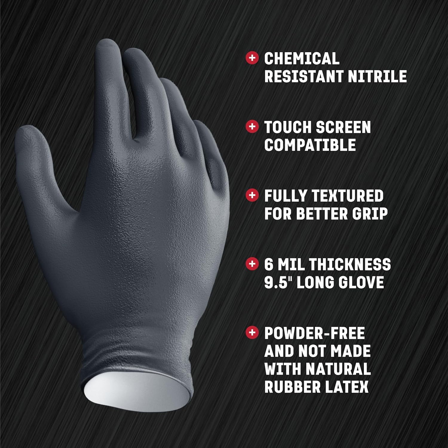 • Heavy-duty disposable gloves are made of 2 layers of black and white nitrile rubber that help identify breakthrough