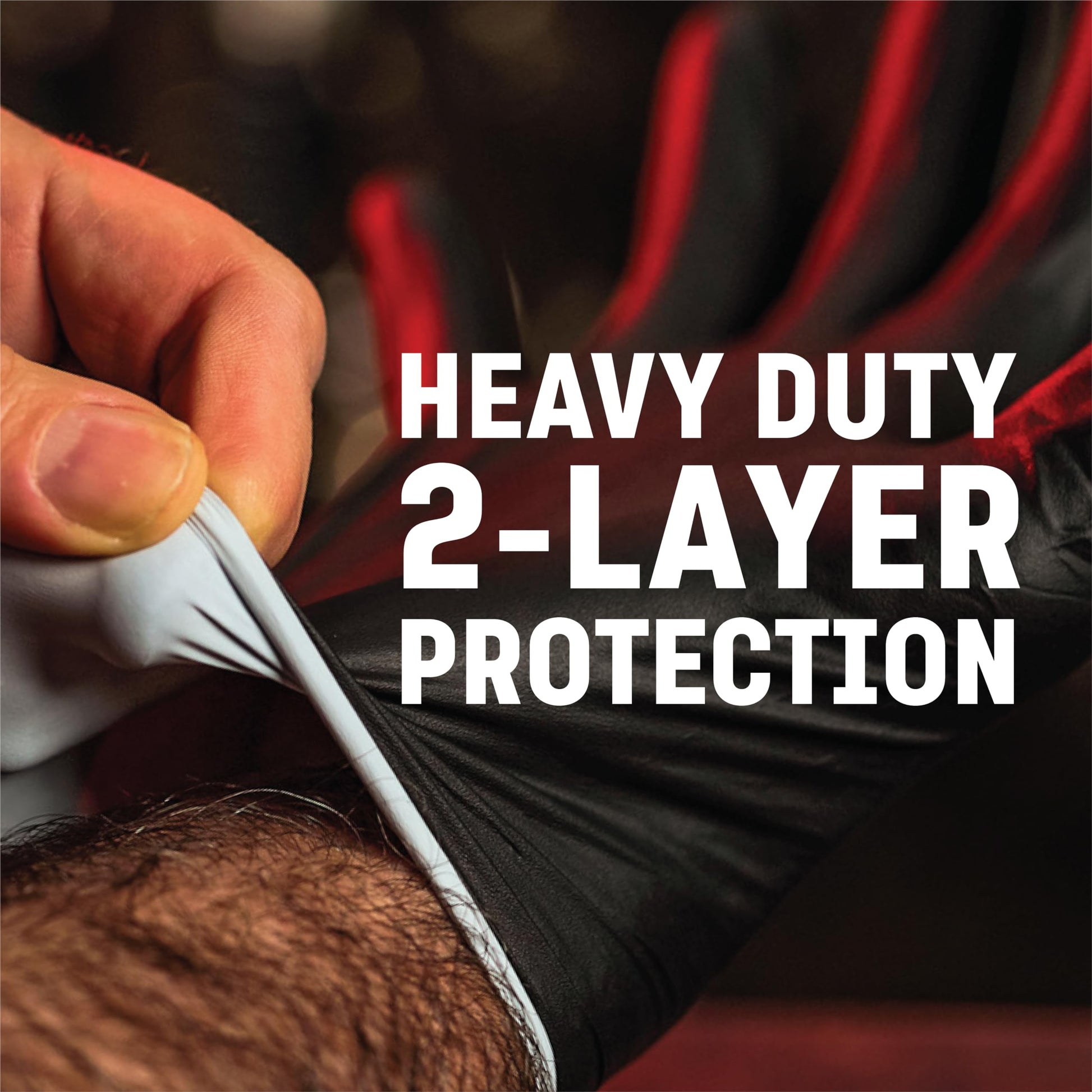 • Heavy duty disposable gloves have 2 premium nitrile layers; black outer layer with break through indicating white inner layer