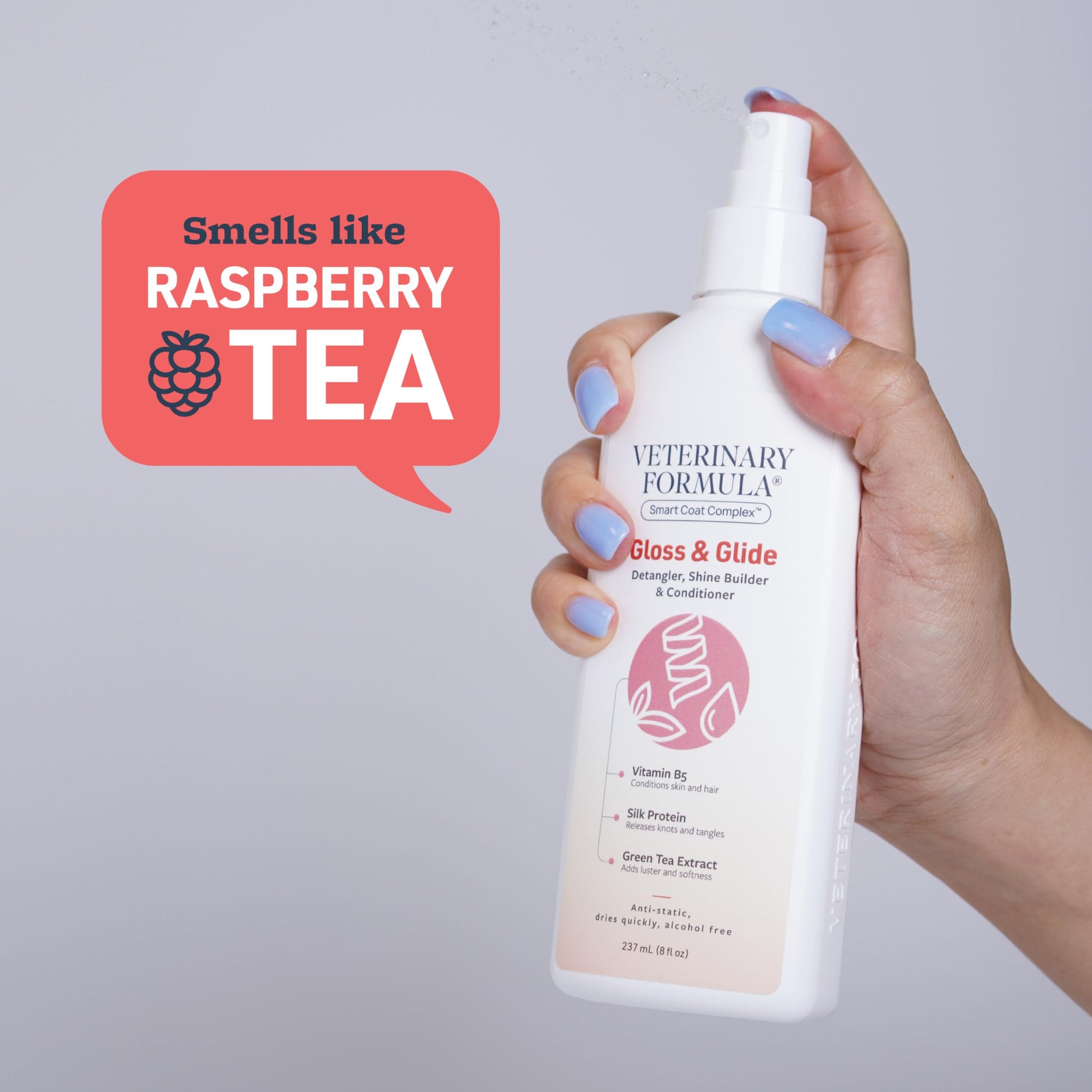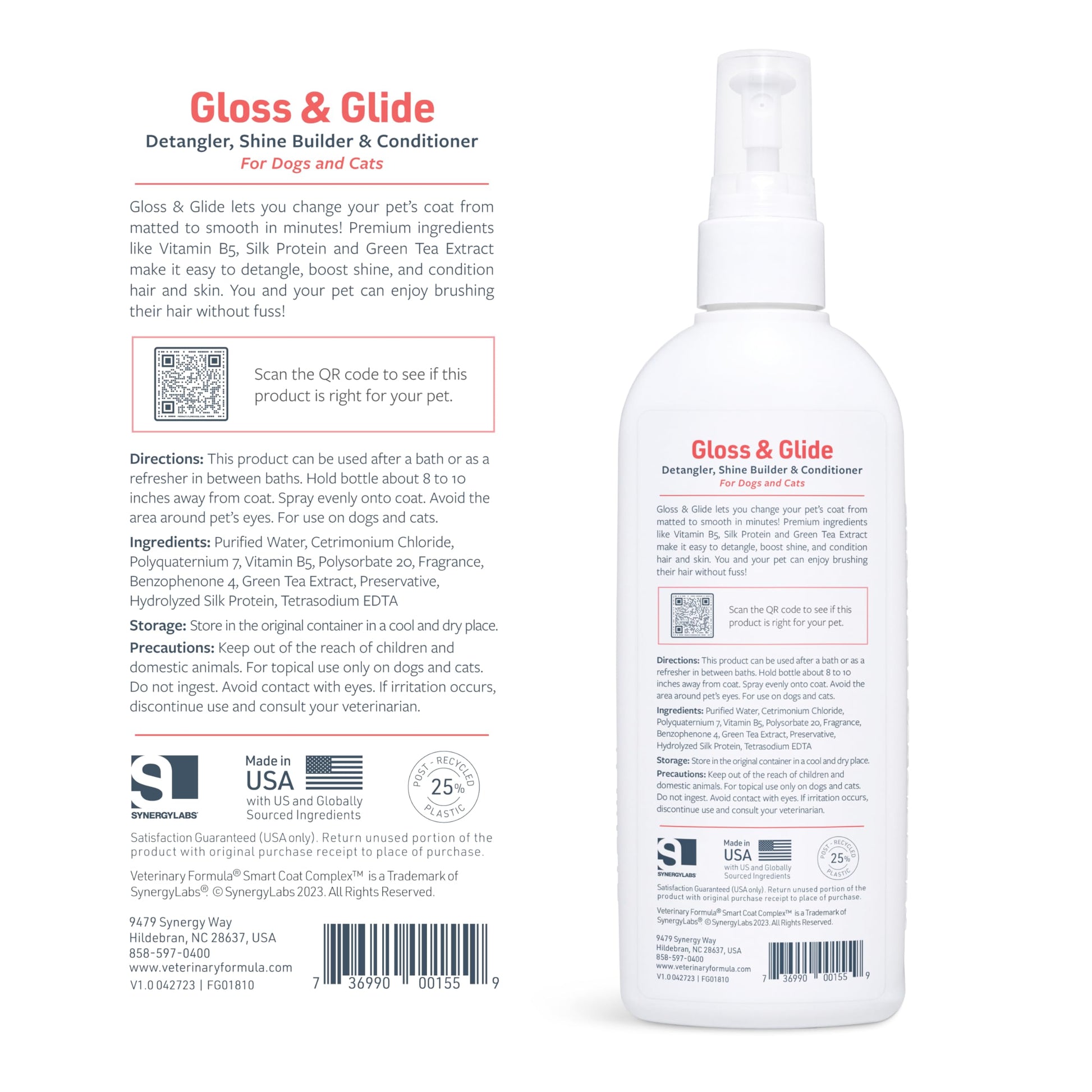 Details: Introducing our Gloss & Glide Detangler for dogs – your go-to solution for effortlessly eliminating knots and tangles post-shampoo. Say goodbye to the struggle of matted hair and hello to a smooth, shiny coat that radiates health and vitality. Our shine builder and spray-in conditioner are expertly formulated with a blend of silk protein, DL-panthenol, and green tea extract, delivering a vibrant, lustrous finish that enhances your dog's natural beauty. Not only does our detangler leave your furry friend looking their best, but it also boasts additional benefits. Alcohol-free and anti-static, it ensures a hassle-free grooming experience while drying quickly for added convenience. Plus, its unique formulation is designed to optimize your dog's skin and coat moisture content and pH balance, promoting overall skin health and vitality. And the best part? Our Gloss & Glide Conditioning Spray isn't just for dogs – it's safe for cats too, making it a versatile grooming essential for all your beloved pets. Like all Veterinary Formula products, it's crafted with premium ingredients to deliver exceptional results, without breaking the bank. We understand that your pets are more than just animals – they're cherished members of the family. That's why we're dedicated pet parents ourselves, committed to providing affordable yet high-quality solutions that prioritize the health and happiness of your furry companions. Trust Veterinary Formula to help your pets look and feel their best, because when it comes to pet care, nothing but the best will do.