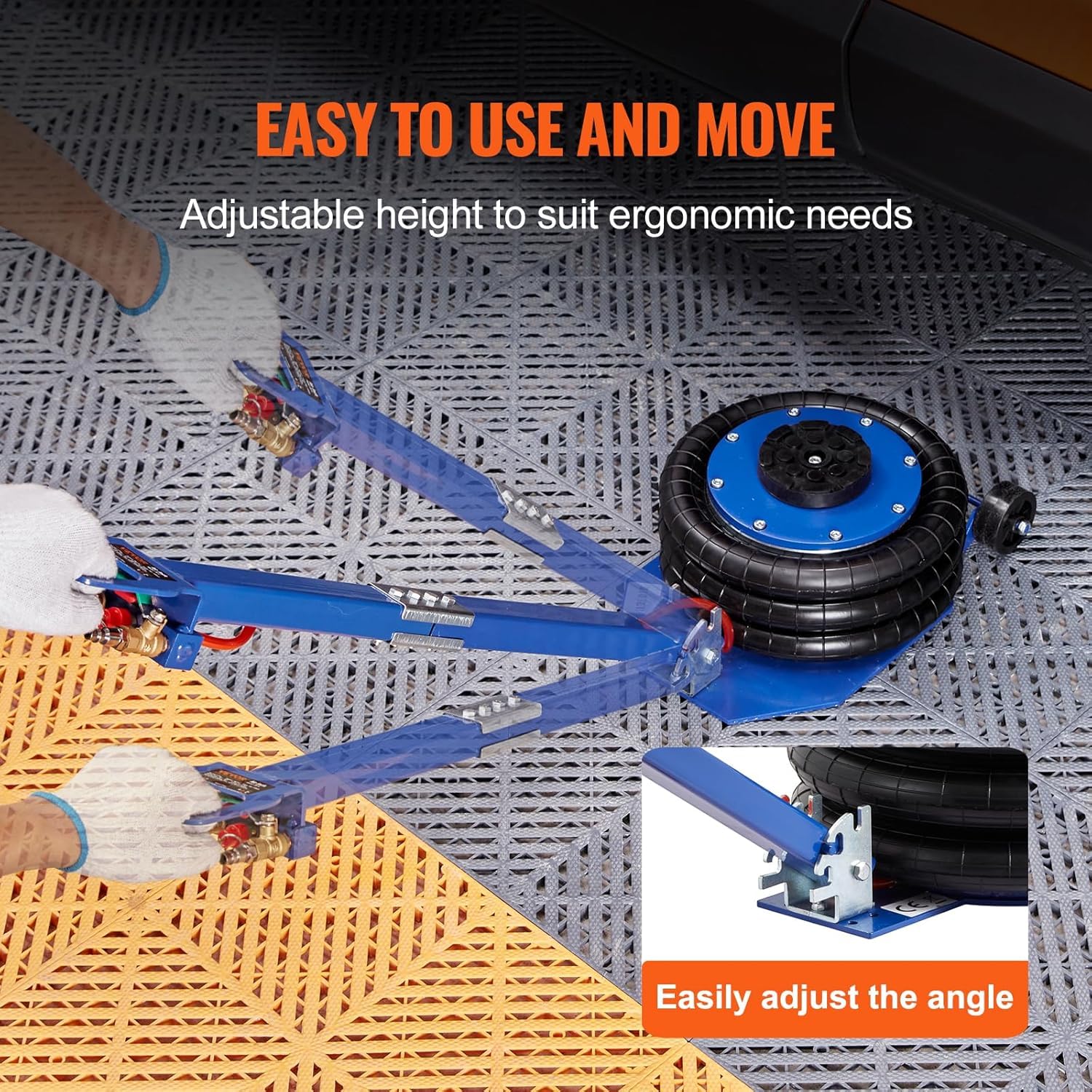 • Effortlessly Operation: Ergonomic design features an adjustable long handle and two casters for effortless maneuverability. You can adjust the angle of the handle for convenient operation, allowing you to position the air bag jack beneath your vehicle without straining your back. The valves are located on the handle for efficient lifting, and by simply connecting the air compressor and operating the valve, our airbag jack can be lifted within a mere 5 seconds.