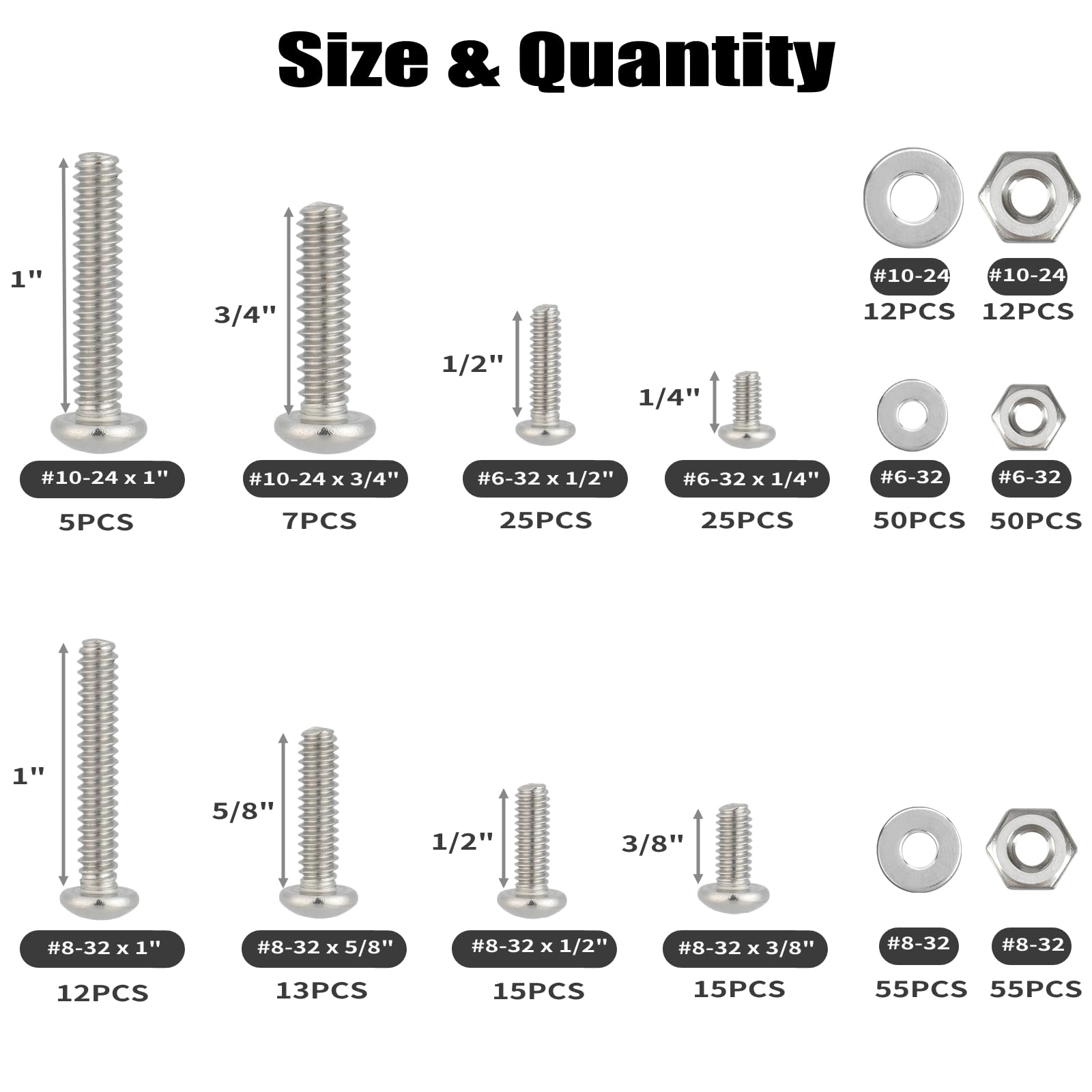 • Phillips Pan Head & Multi Sizes:Including 351pcs 8 sizes of the most commonly used nuts bolts and washers for your choice, #6-32, #8-32,#10-24, SAE Phillips Pan head machine screw,provide 1:1:1 matching combination, each screw matching a nut and a washer.
