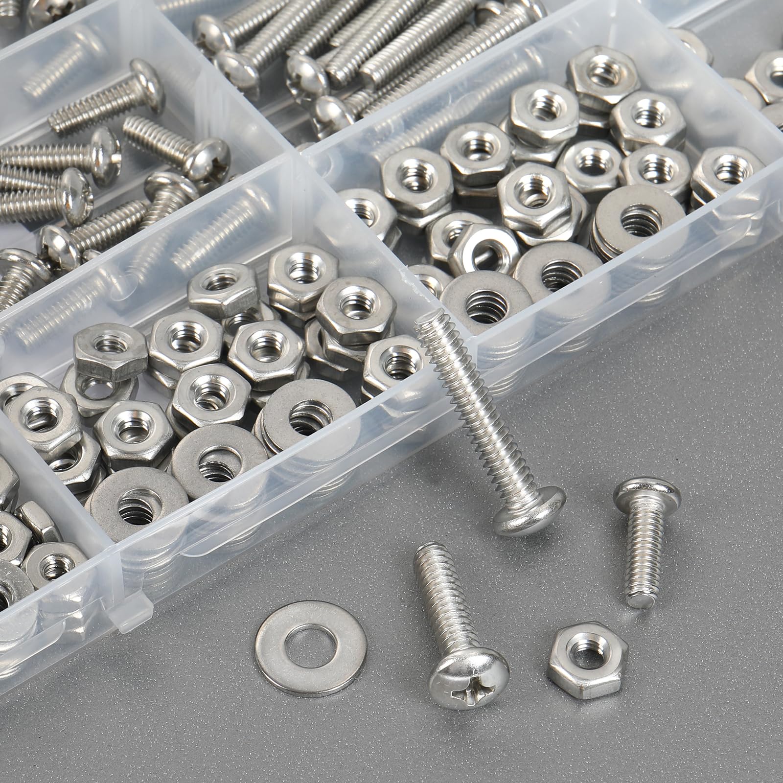 • Reinforced Labeled Case:All nuts and bolts washers are well packed in a transparent labeled storage box with thickened latch and dividers, handy and neat, easy to install and access.