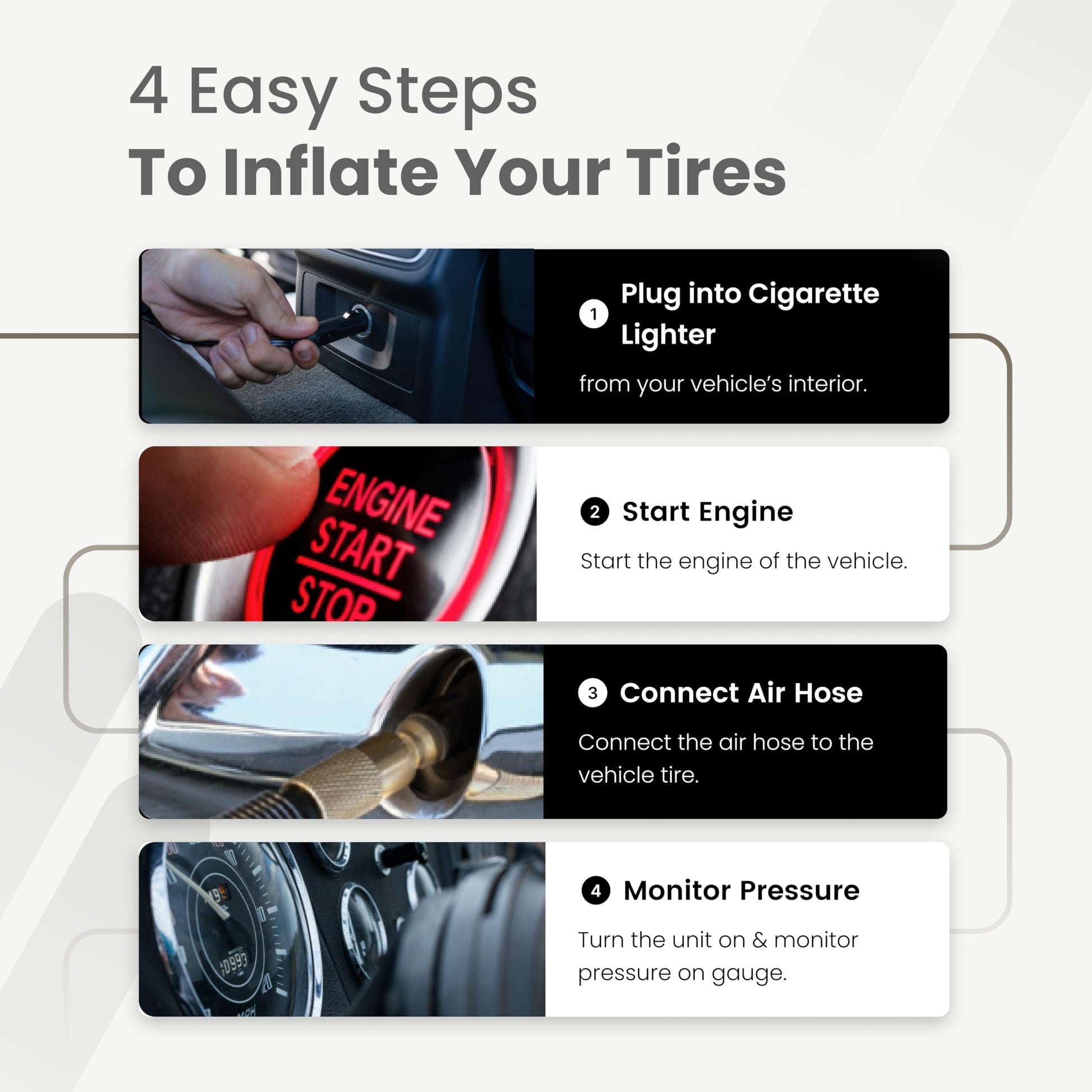 ON-THE-GO PERFORMANCE for VEHICLES, BIKES & SPORTS EQUIPMENT: Cars, Trucks, SUVs, Jeeps, Offroad Vehicles, Side-by-Sides, Motorcycles, Road Bikes, Mountain Bikes, Balls and Rafts. *Instructions: Insert the plug into any cigarette lighter port and start the engine. Connect to a valve stem and turn the unit on. When required, use the included bicycle Presta valve adapter.