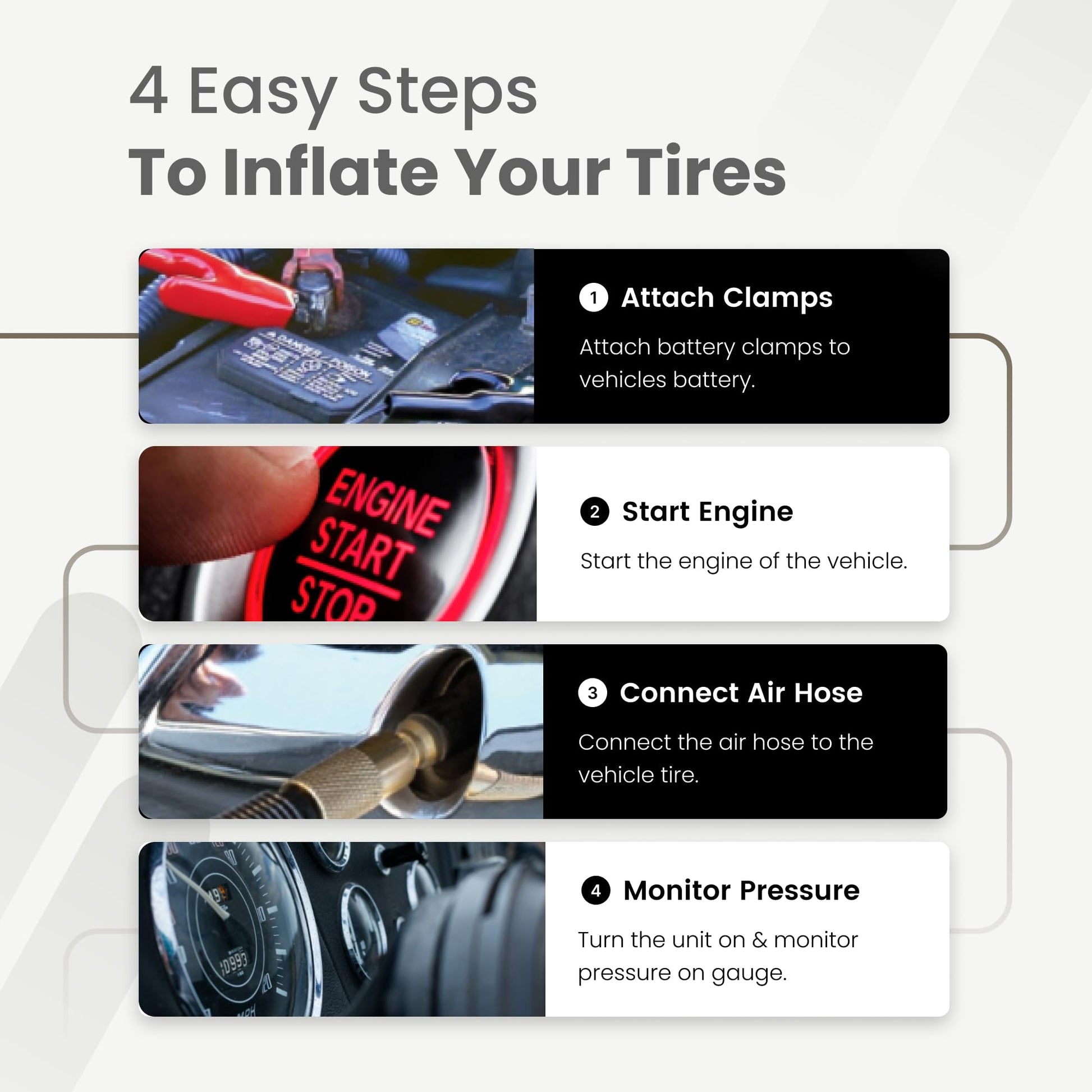 Fast & Easy to Use – No Programming Required Attach the alligator clips to your vehicle's battery terminals, start your engine, and power on the unit. Connect the air hose to your vehicle's tire. The 88P relies on a simple On/Off switch. Simply monitor the pressure gauge and fill to your desired pressure.