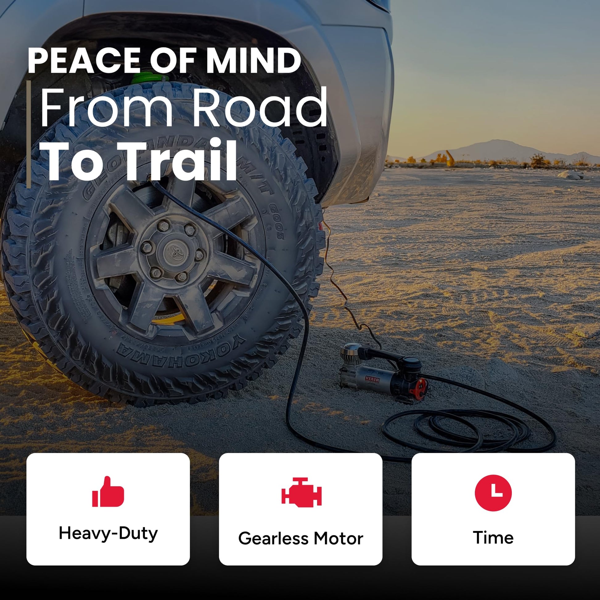 PORTABLE OFFROAD COMPRESSOR (Model: 88P, 120 PSI, 33' Tires) - The 88P Portable Truck Air Compressor: Gear up for rugged trails with this robust 12V air compressor, designed with offroad enthusiasts in mind. Its heavy-duty, gearless motor and maintenance-free operation are perfect for tackling tough terrain. Ultra-compact and storable in its own carrying case, it's an essential tool for any off-road adventure, combining reliability with convenience.