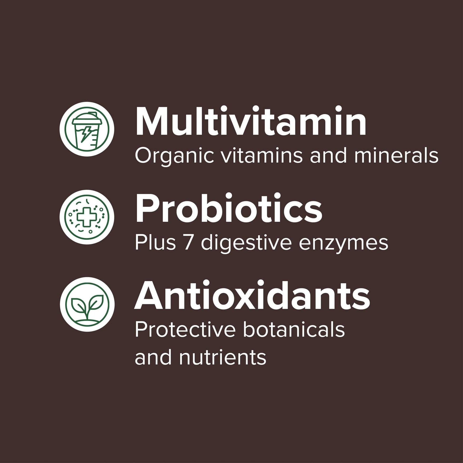 • Made with superfood ingredients to deliver 20 grams of plant protein, antioxidant-rich servings of fruits and vegetables and 25 billion CFU from 12 probiotic strains.