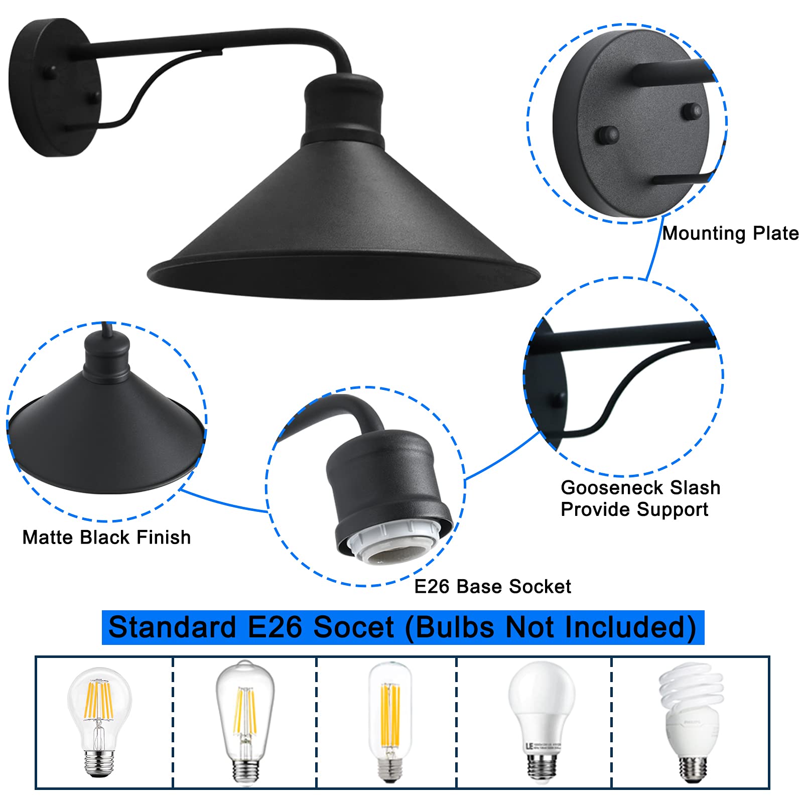 • 【Black Patio Porch Lights Outdoor Wall of Vintage Farmhouse Design】Barn Light is a classic & popular style of farmhouse outdoor lighting products. Simple elements of industrial matte black finish, black interiors & clean lines, create pleasant design that complements any outdoor patio porch backyard decor. Also, outside lights for house are compatible with all E-26 socket bulbs(60W advised,100W MAX), each one can produce different beautiful light, adding a nice touch to your home.