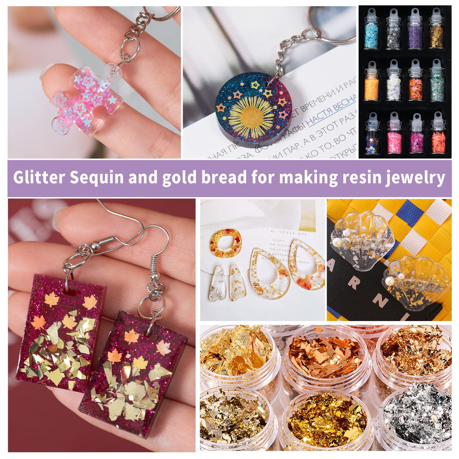 • Kit Contents: Comprehensive set for resin crafting: Includes clear UV resin, UV lamp, silicone mold, color foils, sequins, glitter, metal molds, tools, and accessories