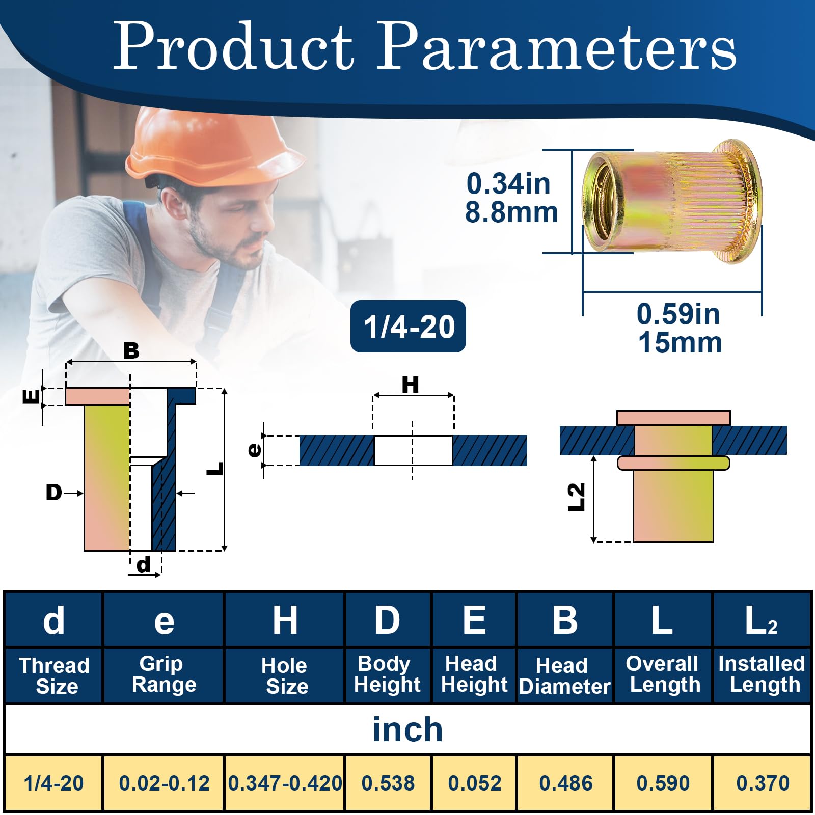• Size and Quantity: 115pcs 1/4 20 rivet nut UNC. which drill hole size is 8.8mm/0.34'', total length is 15mm/0.59''