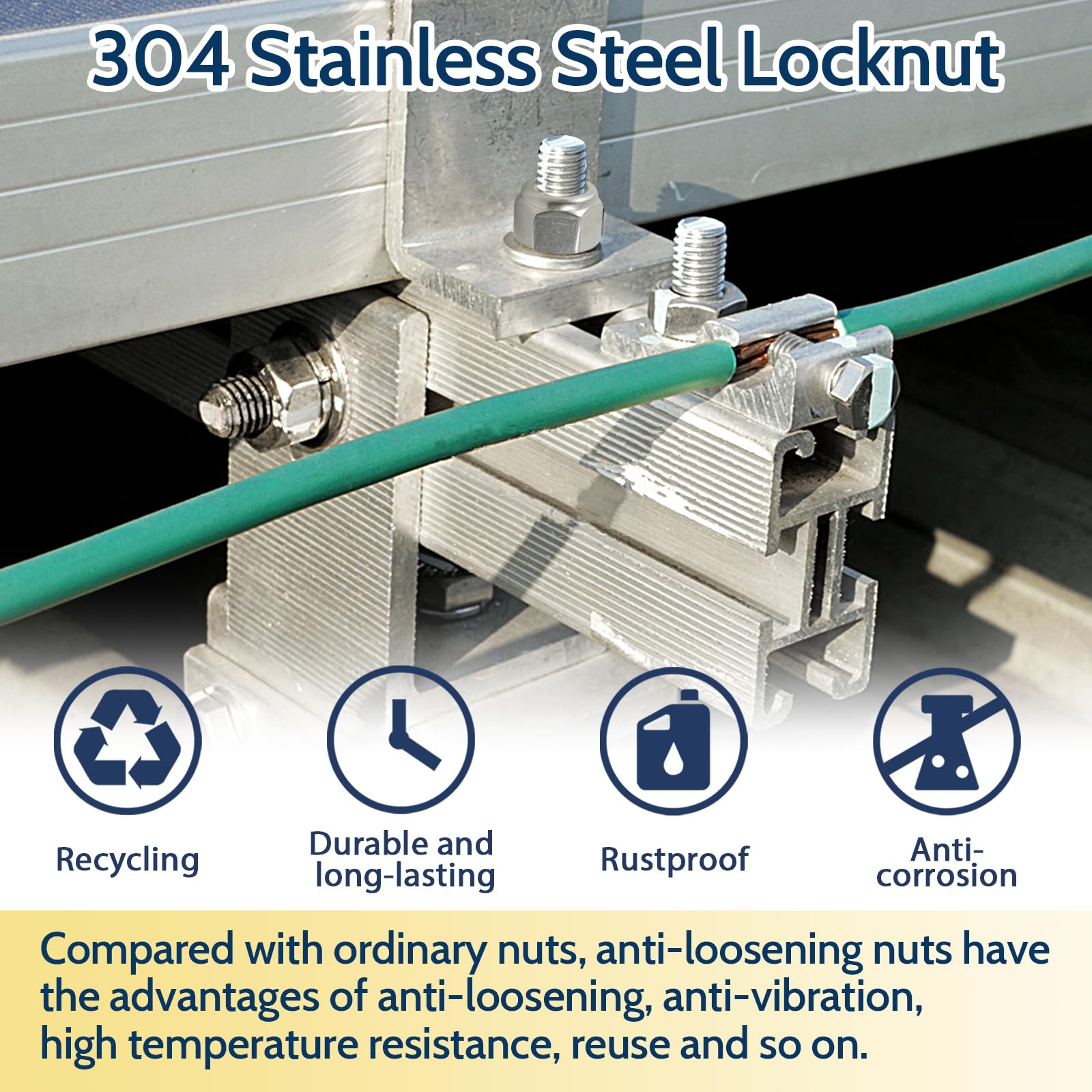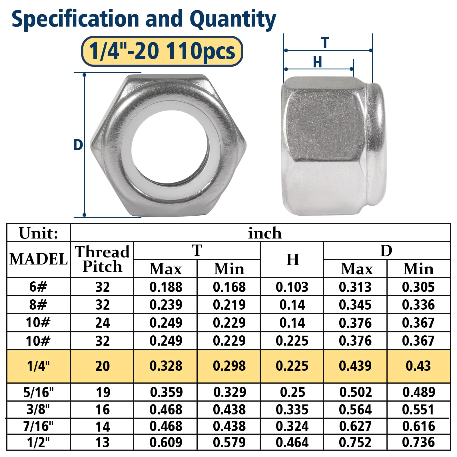 • Nylon Insert Locknut: 1/4'-20 is standard inch threaded nylon locknuts have reliable anti-loosening performance, so that it and the bolt threads to form a close fit, and in the role of the elasticity of the nylon friction resistance, in order to achieve the purpose of anti-loosening. Assembly torque is more stable, anti-loosening is very reliable, can be used in shock vibration occasions
