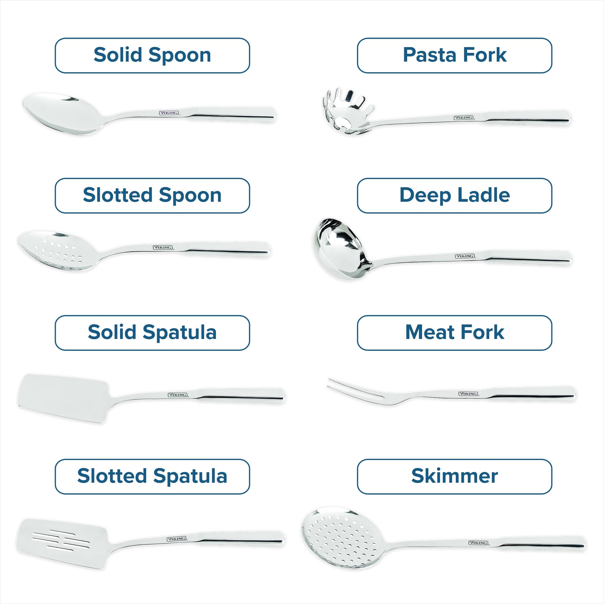 Viking Kitchen Utensils Set, 8 Piece Stainless Steel Cooking Utensil Set, Includes Spatulas, Spoons, Pasta Fork, Deep Ladle, Meat Fork, and Skimmer, Silver