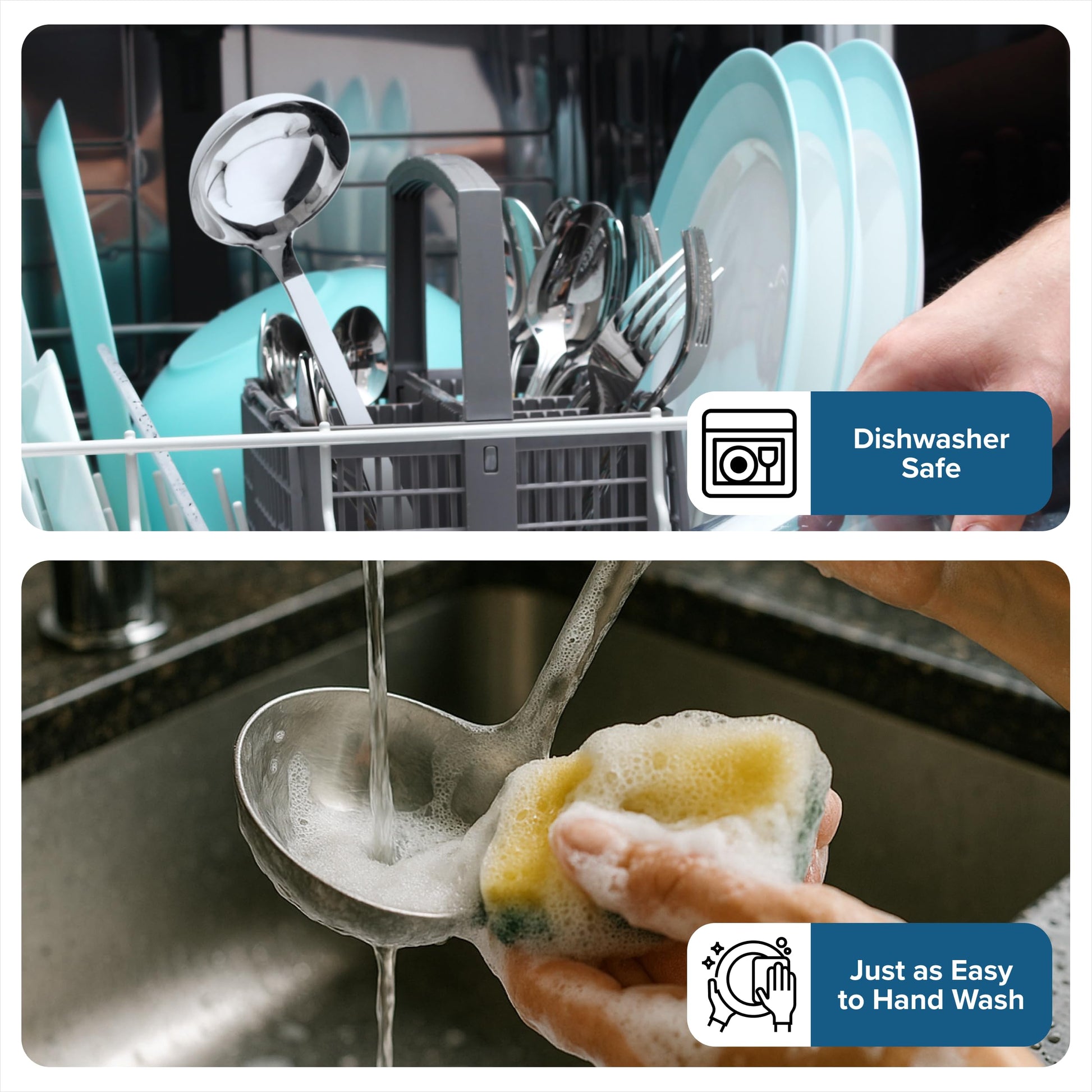 DISHWASHER SAFE: Our kitchenware accessory set features a seamless design which is easy to clean and maintain, ensuring that they remain shiny and ready for preparing your next meal. Our kitchen tool set can be hand washed with hot and soapy water for excellent results, and are also dishwasher safe **Rinse and dry immediately to prevent water spots, DO NOT use steel wool or cleaners containing chlorine beach**