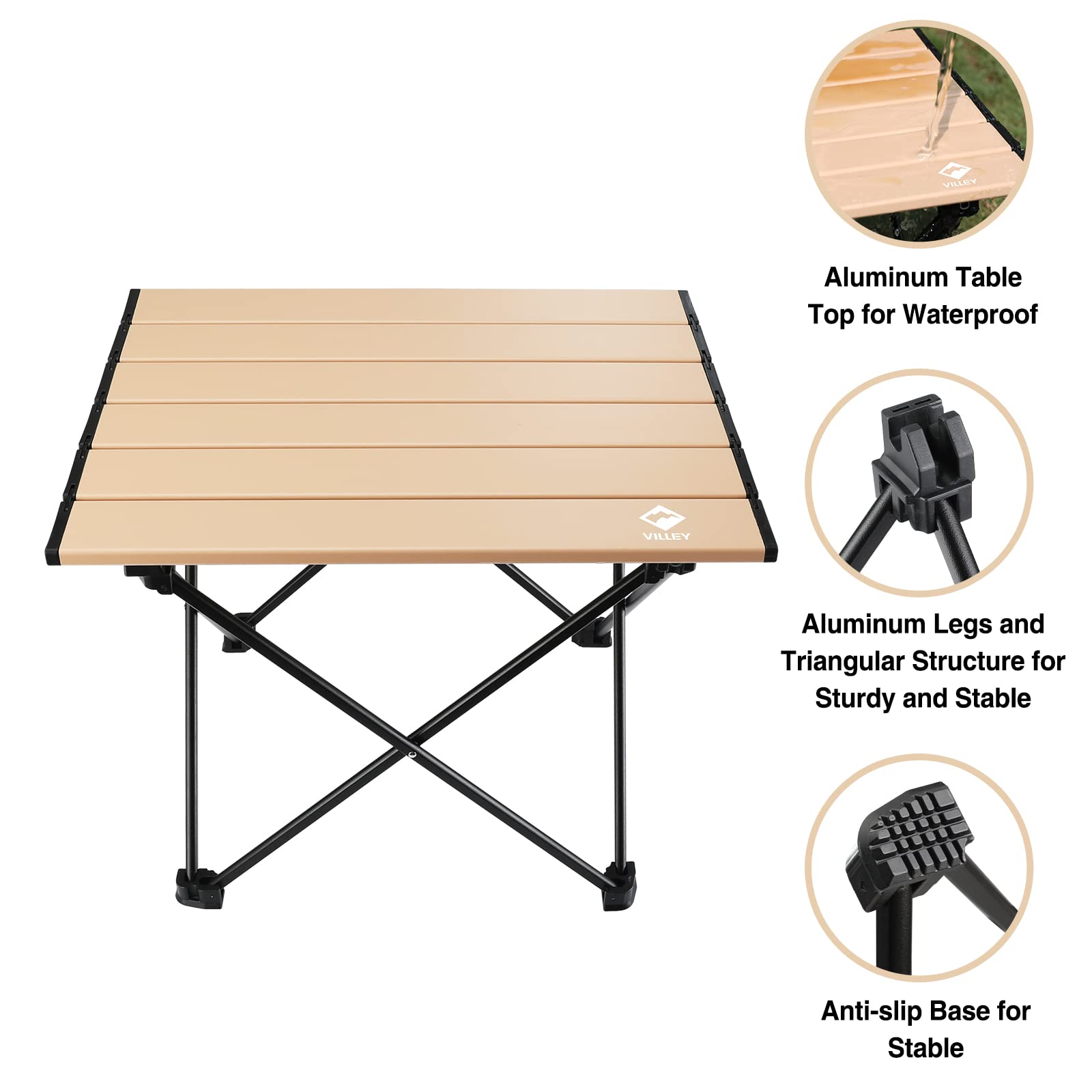 VILLEY Portable Camping Side Table, Ultralight Aluminum Folding Beach Table with Carry Bag for Outdoor Cooking, Picnic, Camp, Boat, Travel - Gold
