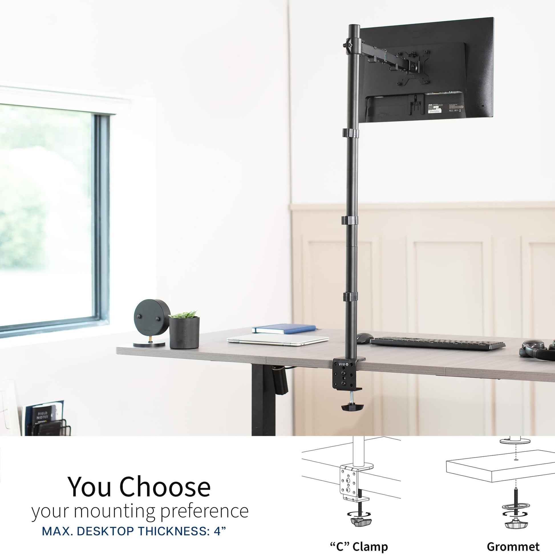 • Drill-Free Mounting: This product secures to your surface of choice up to 4' thick via a heavy-duty C-clamp, or use the equally sturdy optional grommet mount to suit your preferred layout