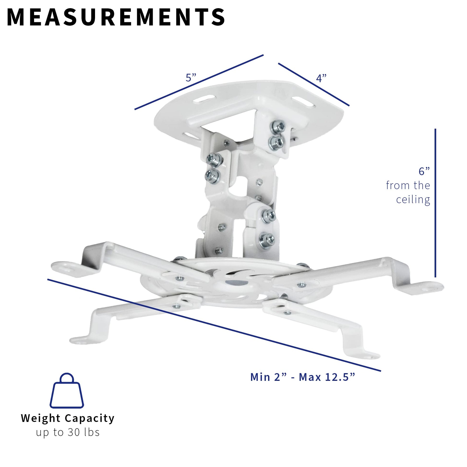 Details: MOUNT-VP01W is a brand new, heavy duty, all steel, universal ceiling projector mount. Ideal for any home or office, this high grade steel mount is weight tested at 30lbs and designed with adjustable arms to fit most projector brands with mounting ranges from 2” to 12.5”. MOUNT-VP01W sits 6” from flat ceilings making it low profile. Features include 15 degree tilt, 15 degree swivel, and 360 degree rotation to maximize projection angles. Simple tightening of joints makes this as fluid or stationary as desired. This is a quick assembly and comes with common mounting hardware. The projector mount comes in a white finish.