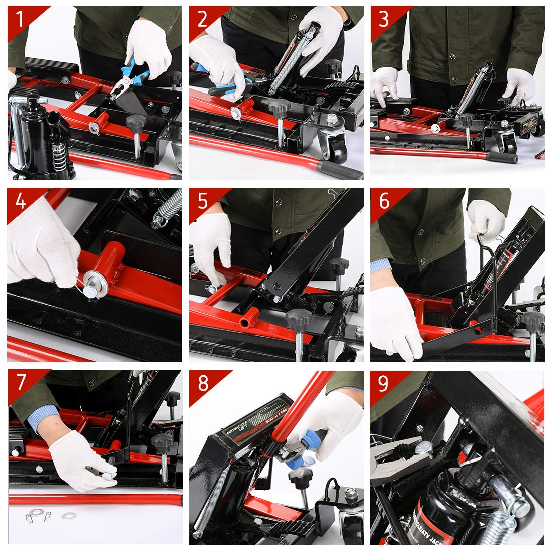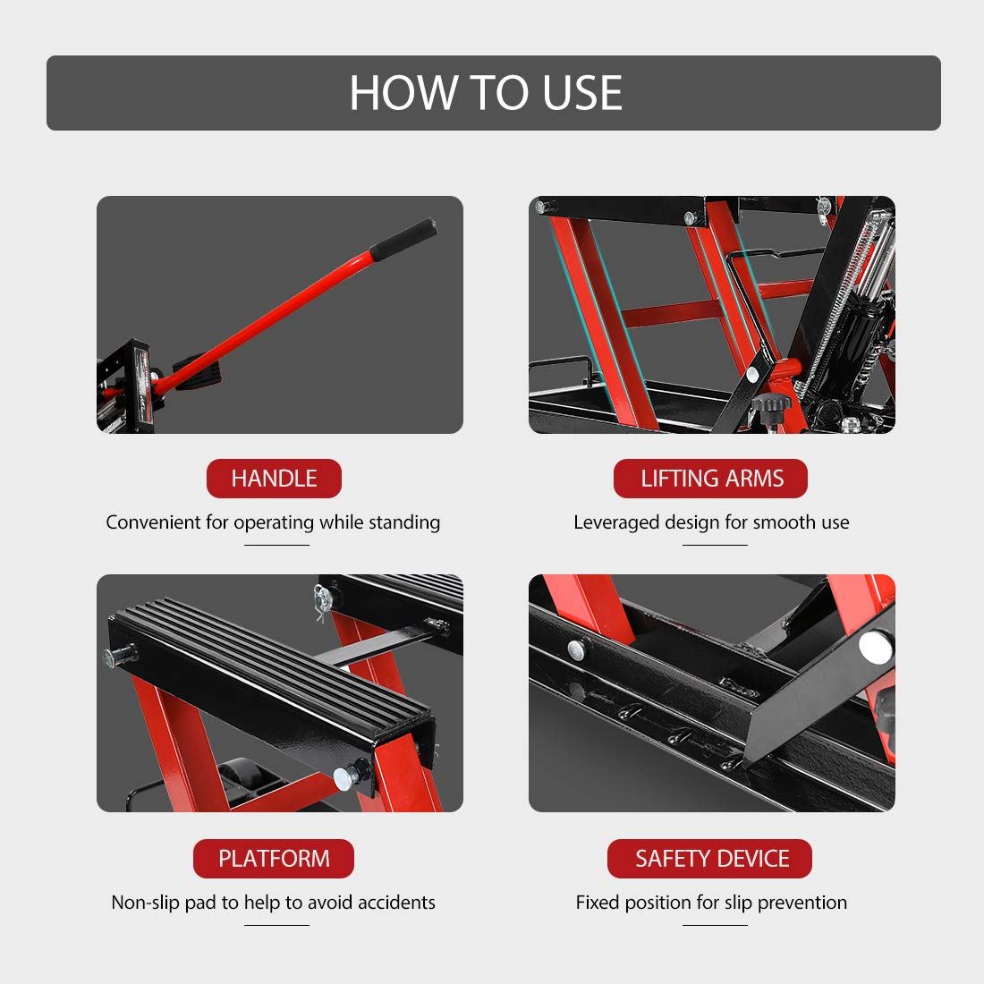 • HIGH-QUALITY MATERIALS - The heavy-duty and solid steel frame of this VIVOHOME motorcycle lift jack comes with a red and black powder-coated finish; The paint coating is oil, grease, and rust-resistant, which is much easier to clean up after repairs; The stand’s top surface has a durable rubber pad with striped veins to help prevent slippage and scratches