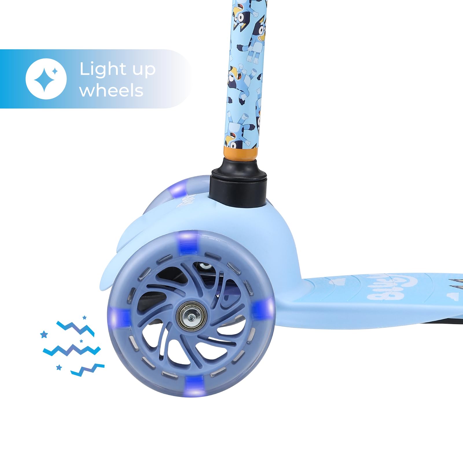 Voyager Self Balancing Kick Scooter with Light Up Wheels, Extra Wide Deck, 3 Wheel Platform, Foot Activated Brake, 75 lbs Limit, Kids & Toddlers Girls or Boys, for Ages 3 and Up, Bluey