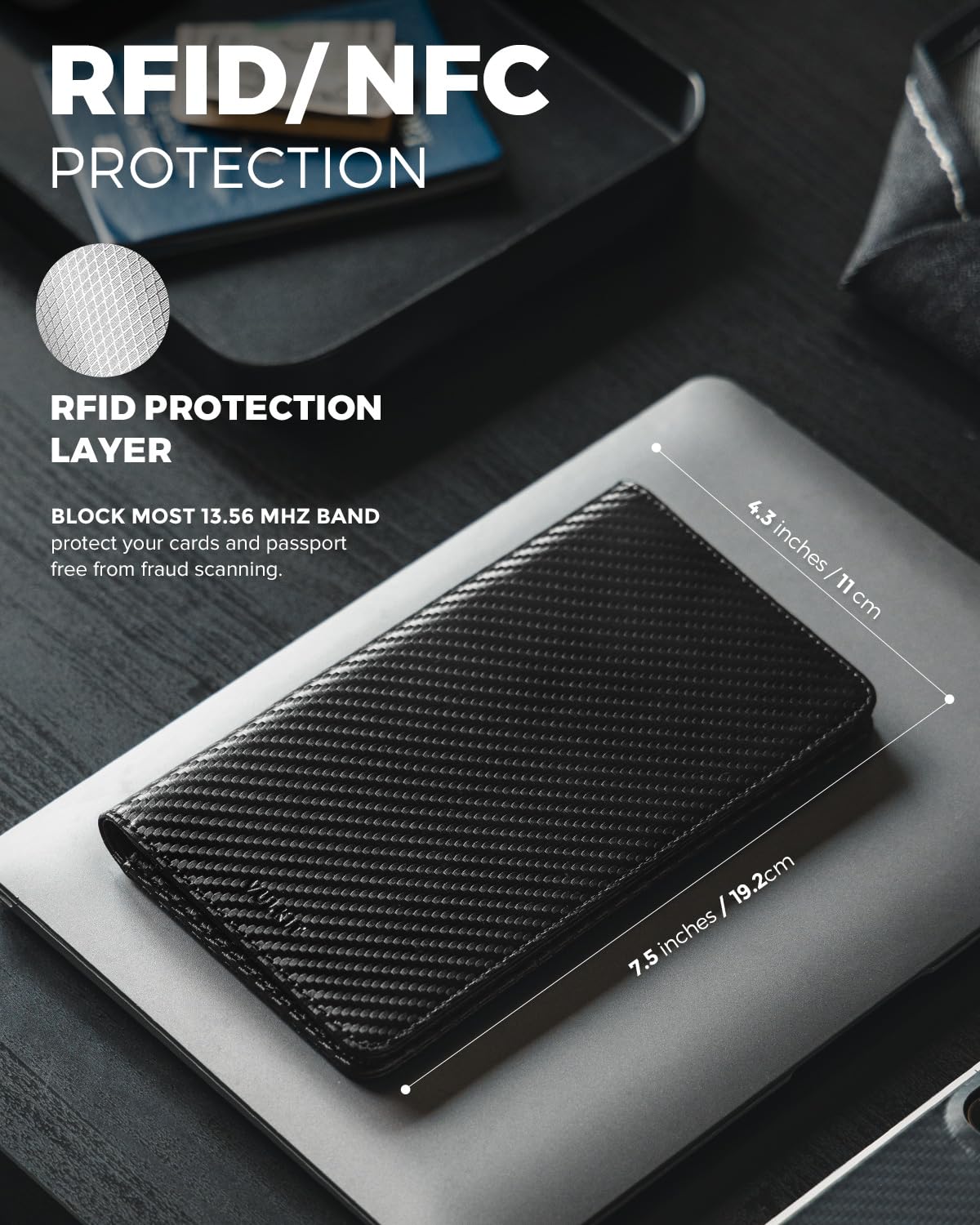 VULKIT Passport Wallet RFID Blocking Travel Wallet for Men & Women, Long Size, Carbon Fiber Black
